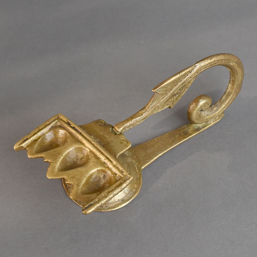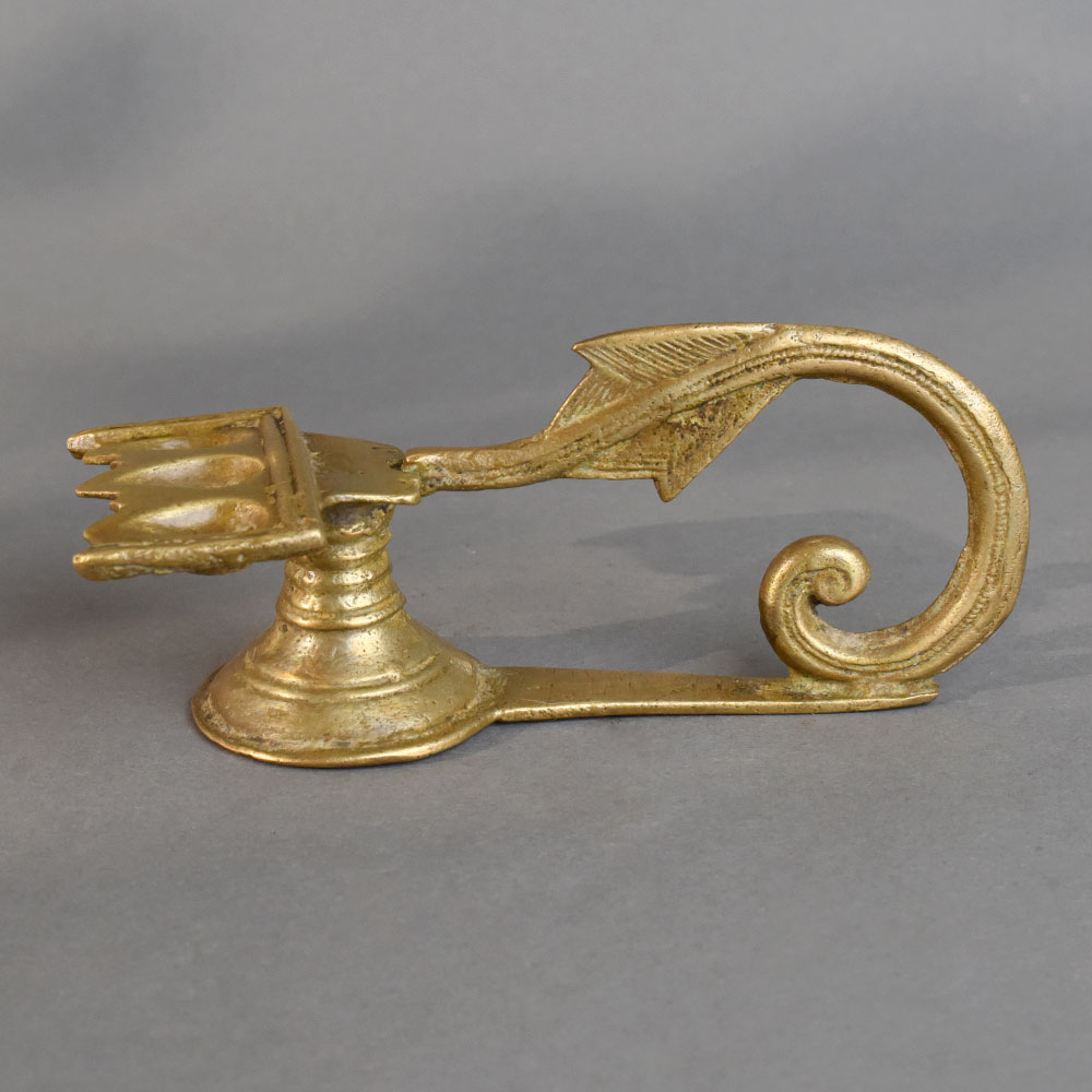 This vintage brass aarti oil lamp with handle is a timeless piece of devotional art, traditionally used in temples and homes during prayer rituals. It features three deep oil cavities designed to hold ghee or oil wicks, symbolizing light and divine energy. The lamp is crafted from solid brass, ensuring durability and an authentic antique appearance. Its gracefully curved handle, decorated with an arrow-like motif, makes it easy to hold while performing aarti, adding both functionality and charm. With its elegant design and spiritual significance, this lamp is perfect for pooja rooms, festive ceremonies, and cultural rituals. Beyond its religious use, it also serves as a collectible piece of heritage decor, reflecting the deep traditions of Indian craftsmanship.