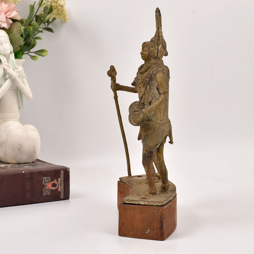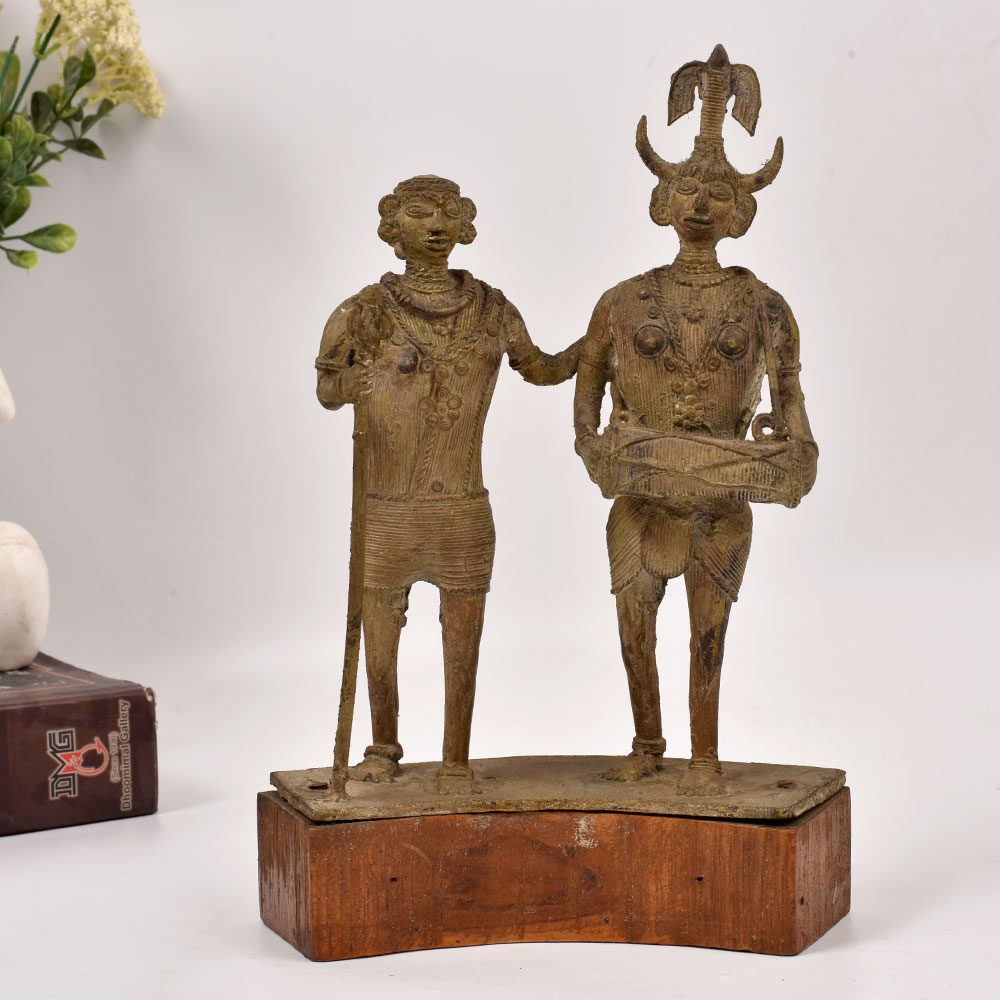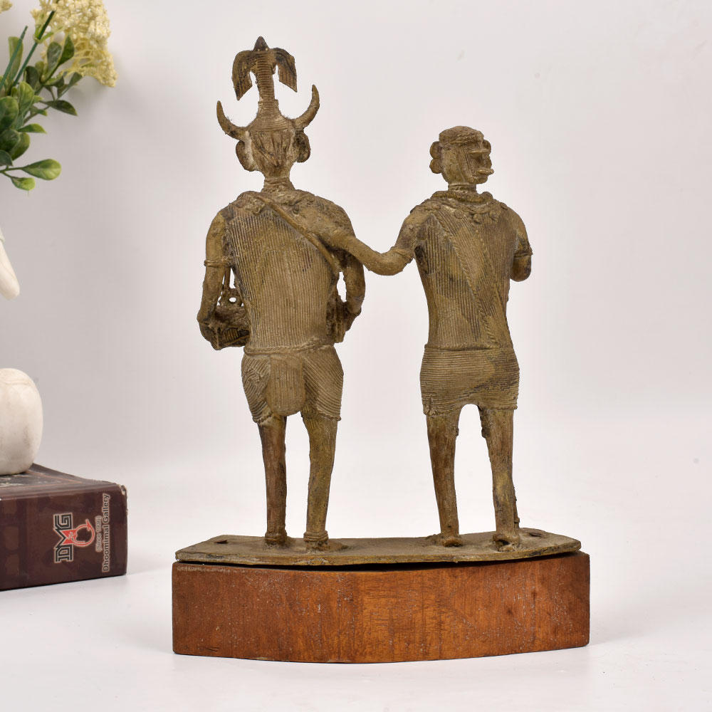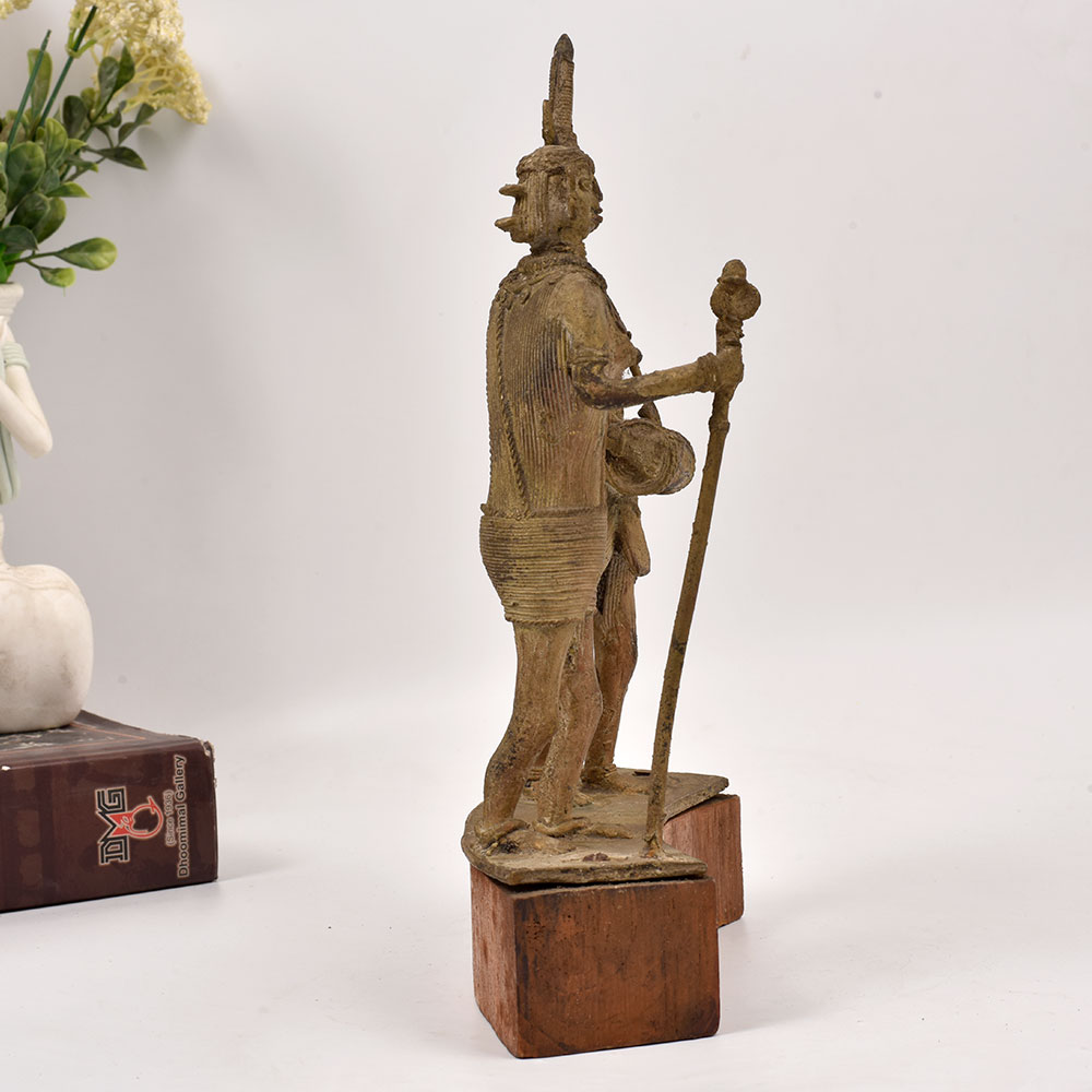 Bring the captivating essence of Central India's vibrant tribal culture into your home with this stunning brass statue. Meticulously crafted, this piece depicts two men standing tall, one masterfully playing a traditional drum, the other firmly grasping a walking stick - a powerful representation of the rhythmic pulse that courses through the veins of these ancient communities. This striking statue is more than just a decorative piece - it's a window into a world of rich heritage and time-honored traditions. Display it proudly, and let its rhythmic energy infuse your living space, transporting you to the heart of India's captivating tribal landscapes. Whether you're a collector of fine art, a lover of cultural artifacts, or simply seeking to add a touch of global flair to your decor, this brass statue is a must-have. Immerse yourself in the timeless allure of tribal artistry and let this striking piece become the centerpiece of your space.