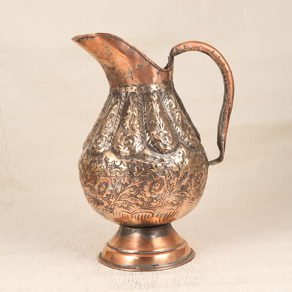 Transport yourself to a bygone era with this stunning vintage copper jug engraved with intricate designs reminiscent of Hyderabad's rich Islamic artistic heritage. This copper jug evokes the romance of ancient Persia and India. Its intricate engravings and pleasing shape make a stylish statement in any kitchen or dining area. Ideal for those who appreciate exotic, artistic touches and old-world charm. Give your home a whisper of the mystical East with this gorgeous centerpiece.