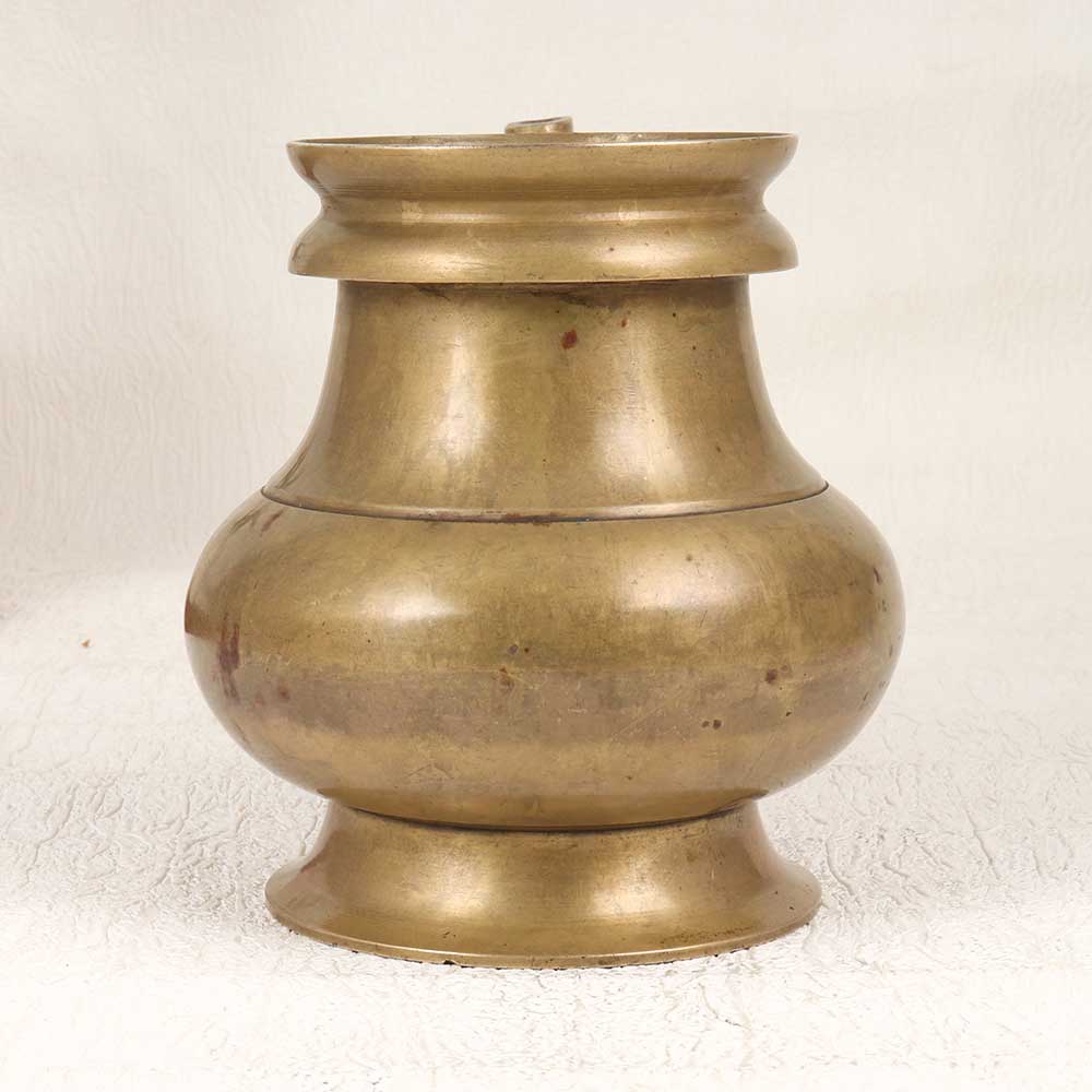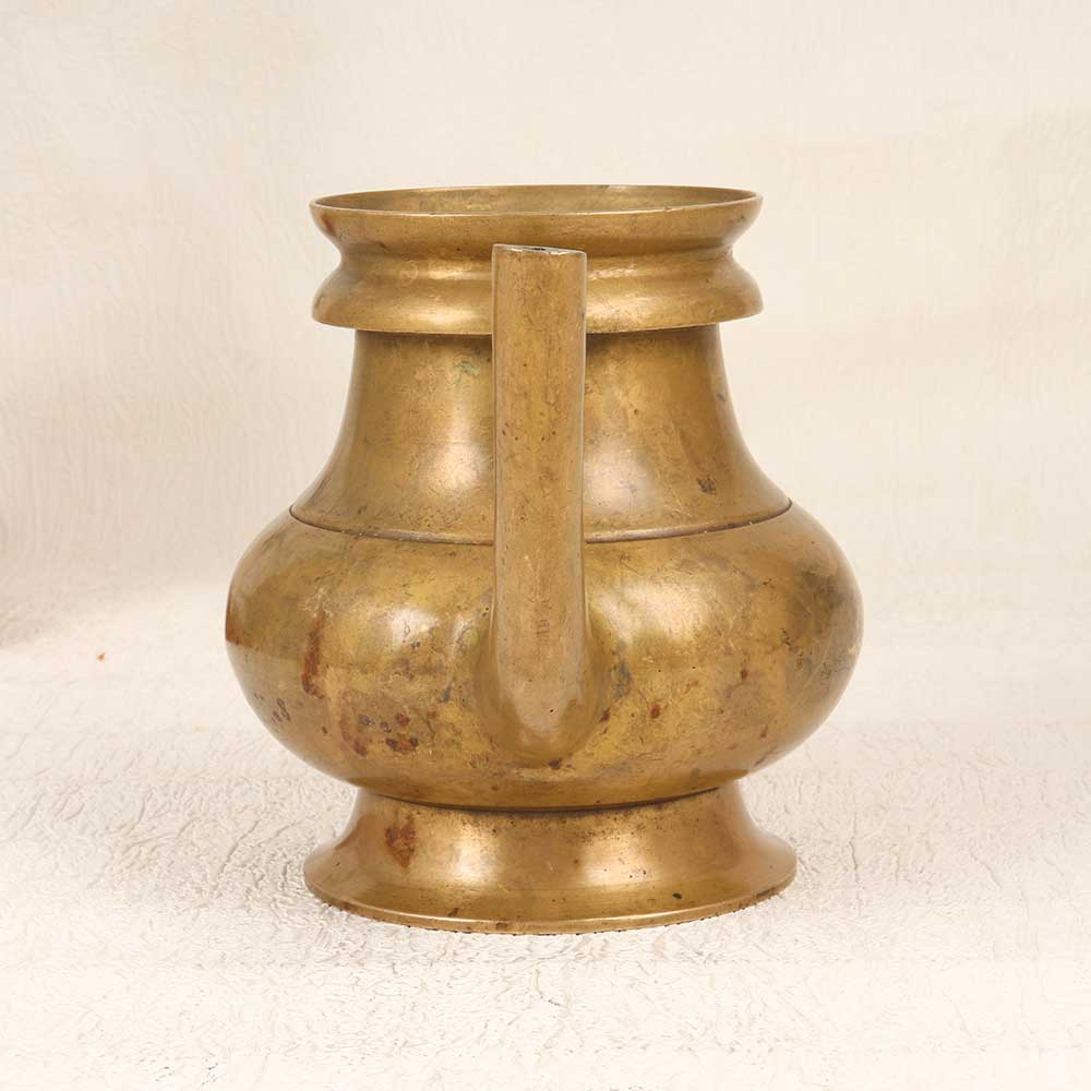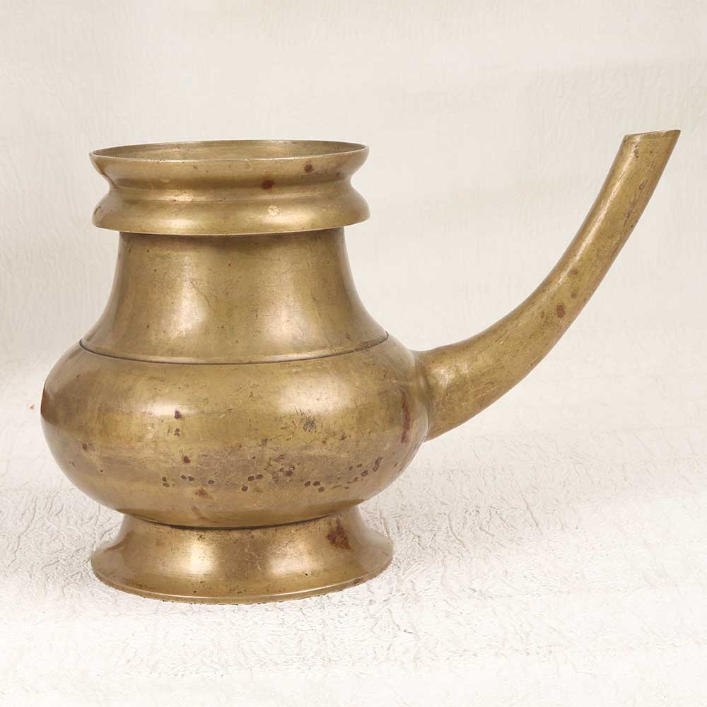 Add an air of antiquity to your home with this stunning vintage brass holy water pot. Crafted in a traditional South Indian style, this elegant vessel features a graceful curved spout and intricate etched details for a truly one-of-a-kind accent piece. This eye-catching holy water pot lends its charm to any space. Place it on your entryway table or mantle to greet guests with its warm, welcoming presence. Use it in a puja room or home temple to hold and pour sacred water. The smooth, curved spout makes it easy to serve holy water without spilling. Let it's antique styling and cultural flair infuse your home with an exotic, worldly spirit. For those who appreciate handicrafts and want to bring some old-world atmosphere into their home, this brass pot makes a stunning decorative piece. It's vintage design and traditional origins make a meaningful addition to your collection of spiritual objects and decor.