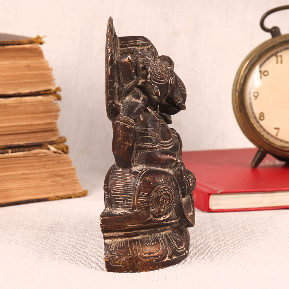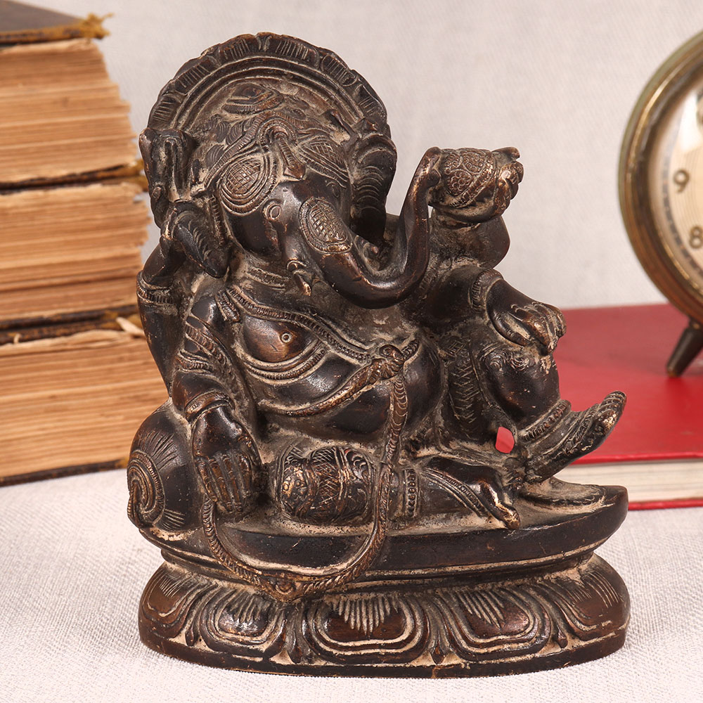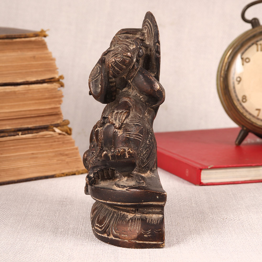 Buy a Vintage Brass Statue of Lord Ganesha online which is meticulously crafted by highly skilled and experienced Indian artisans. This exquisite masterpiece showcases Lord Ganesha seated regally on a platform, elegantly resting on a cushion in an antique brown finish. Crafted from high-quality brass, this statue radiates timeless beauty and craftsmanship. It embodies the rich cultural heritage of India, capturing the essence of spirituality and tradition. This versatile piece can enhance the ambiance of your home, office, restaurant, hotel, shop, or cafe. Place it in your prayer room as a divine symbol, or use it as a captivating decoration that adds a touch of vintage charm to any space. Perfect for vintage collectors, this statue is a conversation starter, making it an ideal addition to exhibitions. It's also a thoughtful gift for your loved ones on special, festive, or auspicious occasions, symbolizing blessings, prosperity, and the enduring spirit of Lord Ganesha.