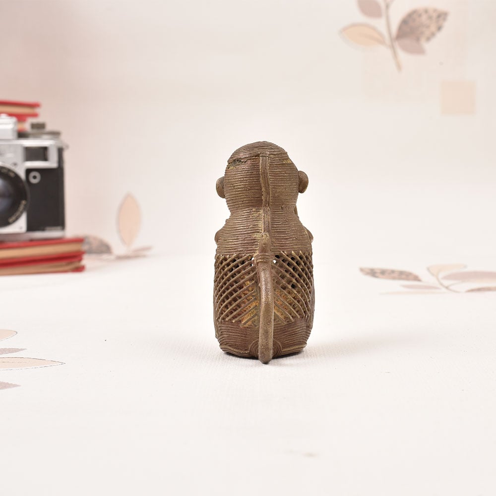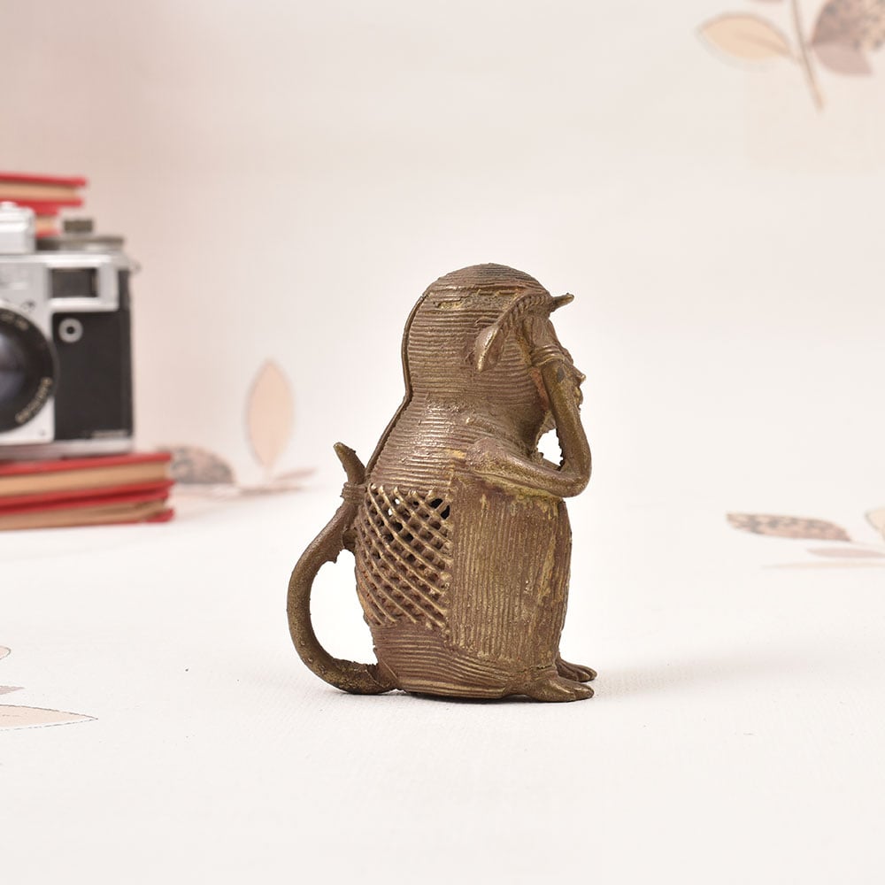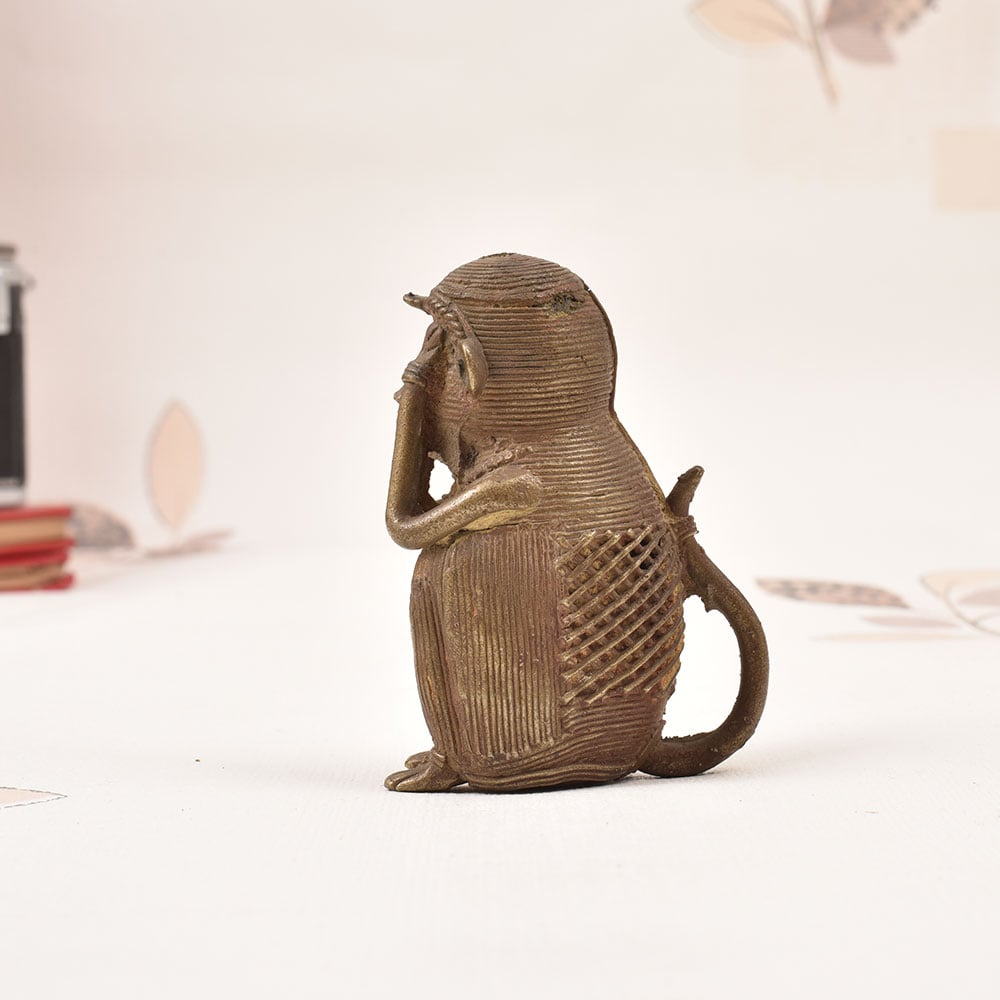 Bring the mystique and wonder of ancient tribal cultures into your home with this captivating Brass Tribal Monkey Statue. Crafted with exquisite detail by skilled artisans in the Odisha region of India, this striking figure commands attention and sparks the imagination. This brass monkey statue is more than just a decorative piece - it's a window into a world of cultural heritage and spiritual symbolism. The monkey's hands-over-eyes gesture is a powerful representation of the idea that "see no evil, hear no evil, speak no evil." It's a reminder to be mindful, to avoid negativity, and to focus on the positive. Bring this unique work of tribal art into your living room, office, or meditation space, and let it inspire moments of thoughtfulness and self-reflection. Whether you're drawn to its exotic aesthetic or its deeper meaning, this brass monkey statue is sure to elevate the energy of any space and start conversations with guests. Embrace the wisdom of the ages with this captivating Odisha treasure.
