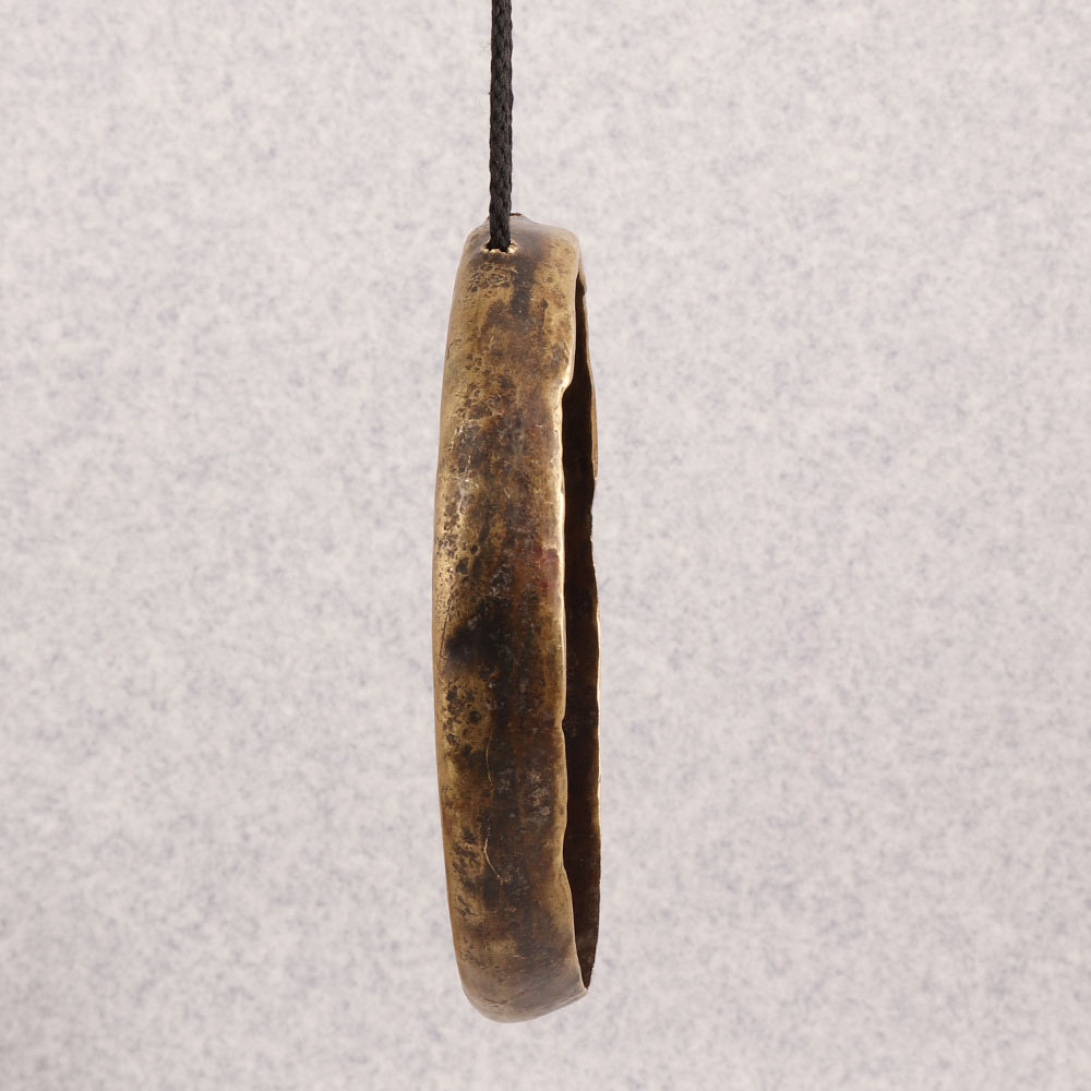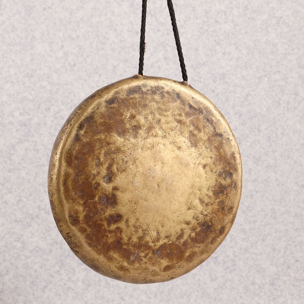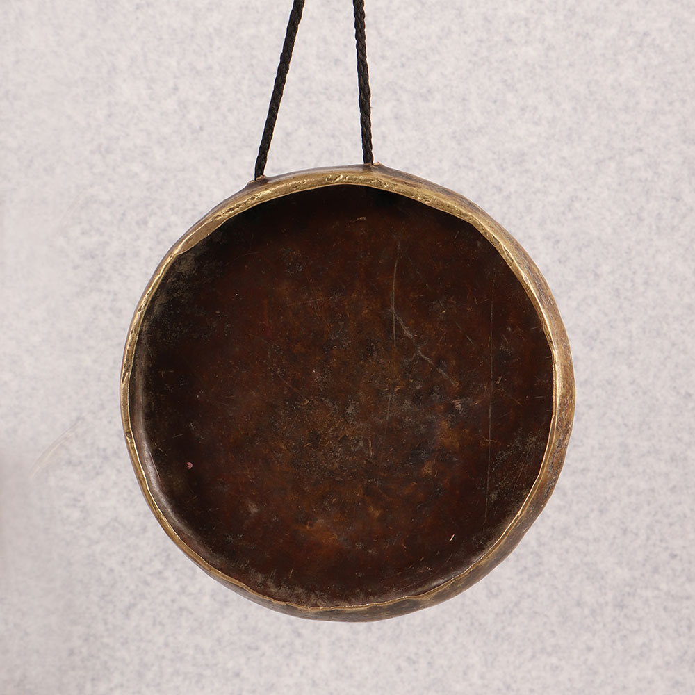 A Vintage Bell Metal Gong that is a masterpiece crafted by highly skilled artisans in the timeless Tibetan art tradition. This captivating piece boasts a rich antique brown finish that adds a touch of old-world charm to any space. Handmade with precision and care, the gong is forged from high-quality bell metal, ensuring durability and a resonant, melodious sound. Equipped with a delicate string for easy hanging, this gong becomes a versatile addition to your home, office, restaurant, hotel, or cafe, seamlessly blending into various settings as a striking decorative element. Its unique design and artisanal craftsmanship make it a standout piece in any collection of vintage treasures. The Vintage Bell Metal Gong serves not only as a visual delight but also holds therapeutic properties, creating soothing, calming tones when struck. Place it in your meditation space or use it during mindfulness practices to enhance the atmosphere. This timeless artefact is not just a charming décor item but also a meaningful and thoughtful gift for your loved ones on special, festive, or auspicious occasions.