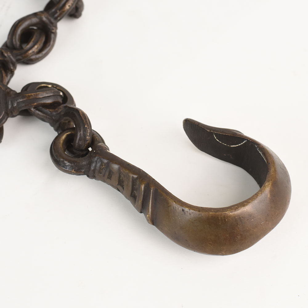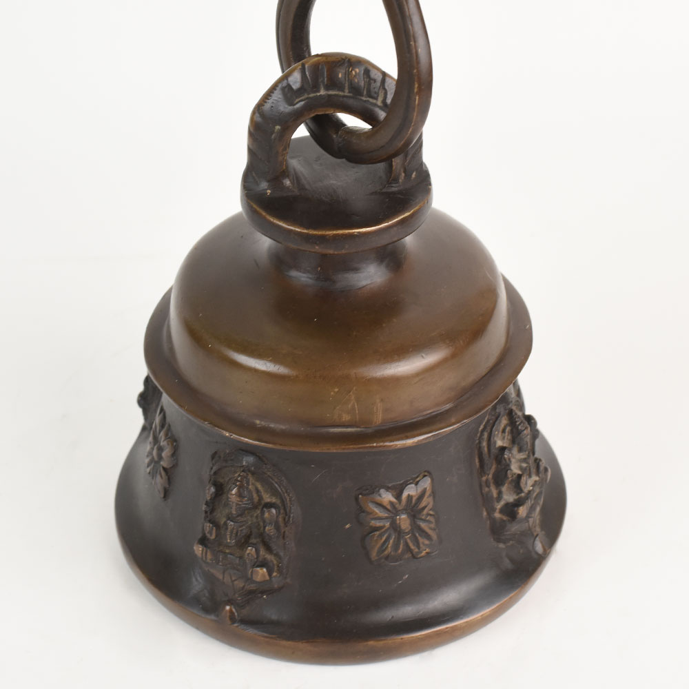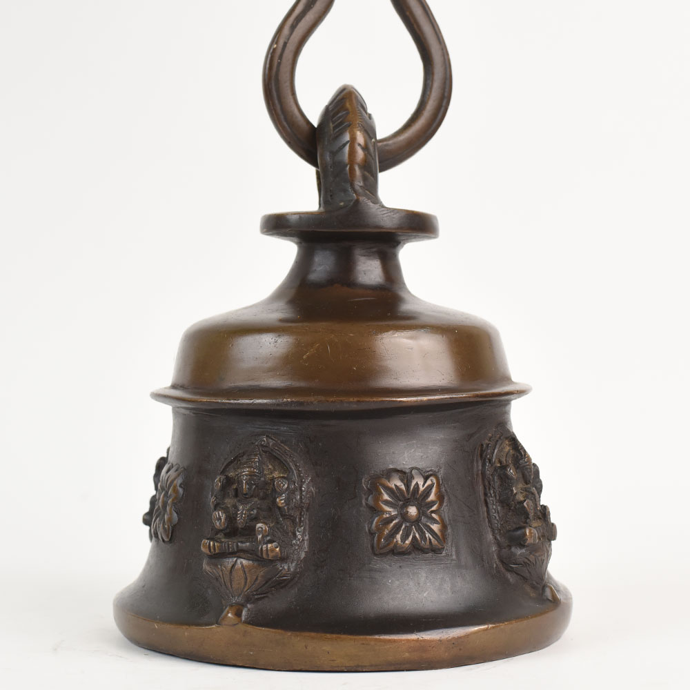 This vintage handmade temple bell is a striking example of traditional Himalayan art, crafted from durable bell metal and designed for spiritual spaces, altars, and authentic decor settings. Featuring detailed embossed motifs around the bell body, it reflects the artistic heritage of Himalayan temples where such bells are used for rituals, prayers, and meditation. The attached solid metal chain and hook allow easy hanging in entryways, shrines, or home temples, making it both decorative and functional. The bells rich patina and aged finish add to its charm, giving it a timeless vintage appeal ideal for collectors or enthusiasts of sacred art. Whether used as a spiritual accessory, a decorative accent, or a unique collectible, this bell brings an aura of devotion and tradition to any space. Its deep resonant sound makes it suitable for daily rituals, meditation practices, or simply as a statement piece of cultural craftsmanship.