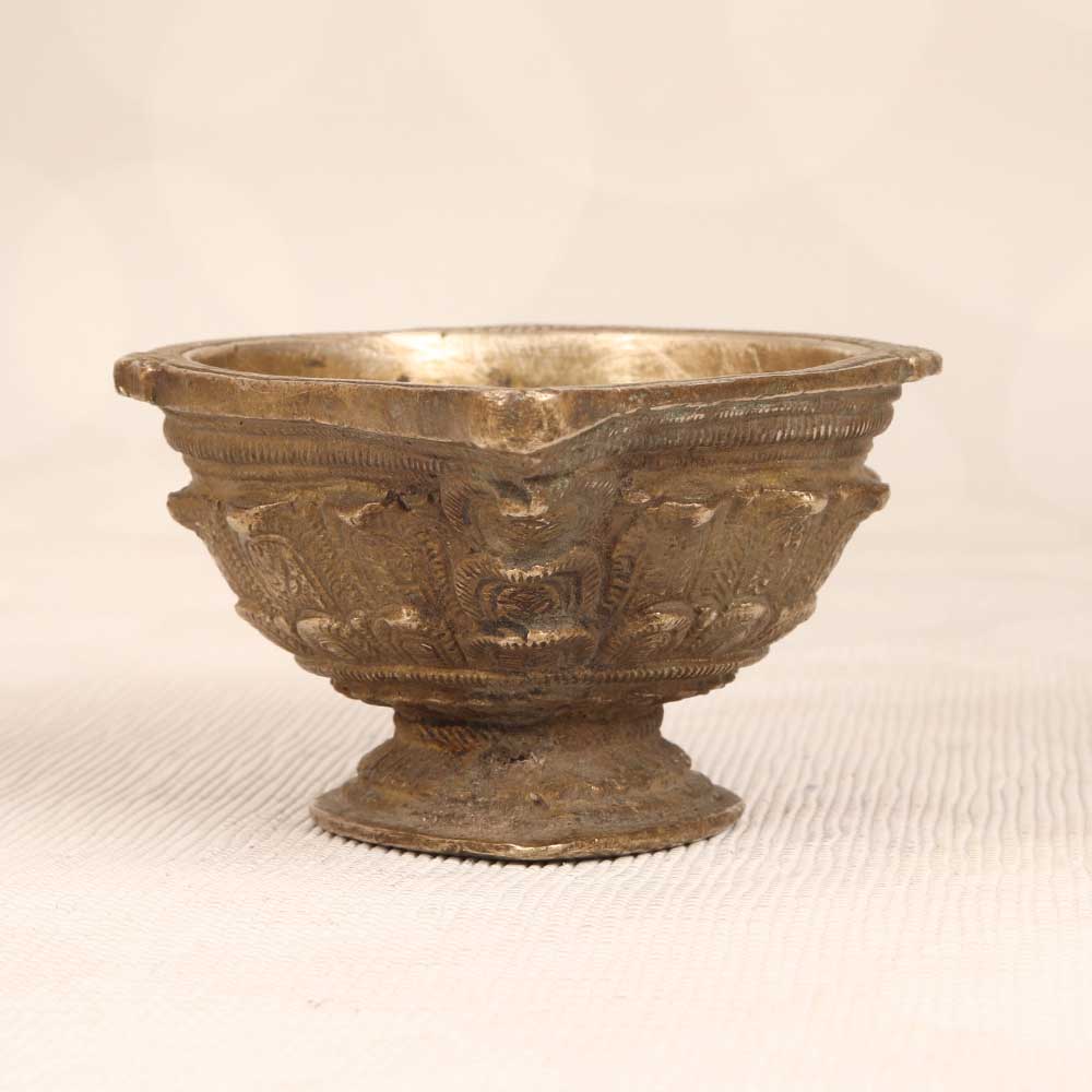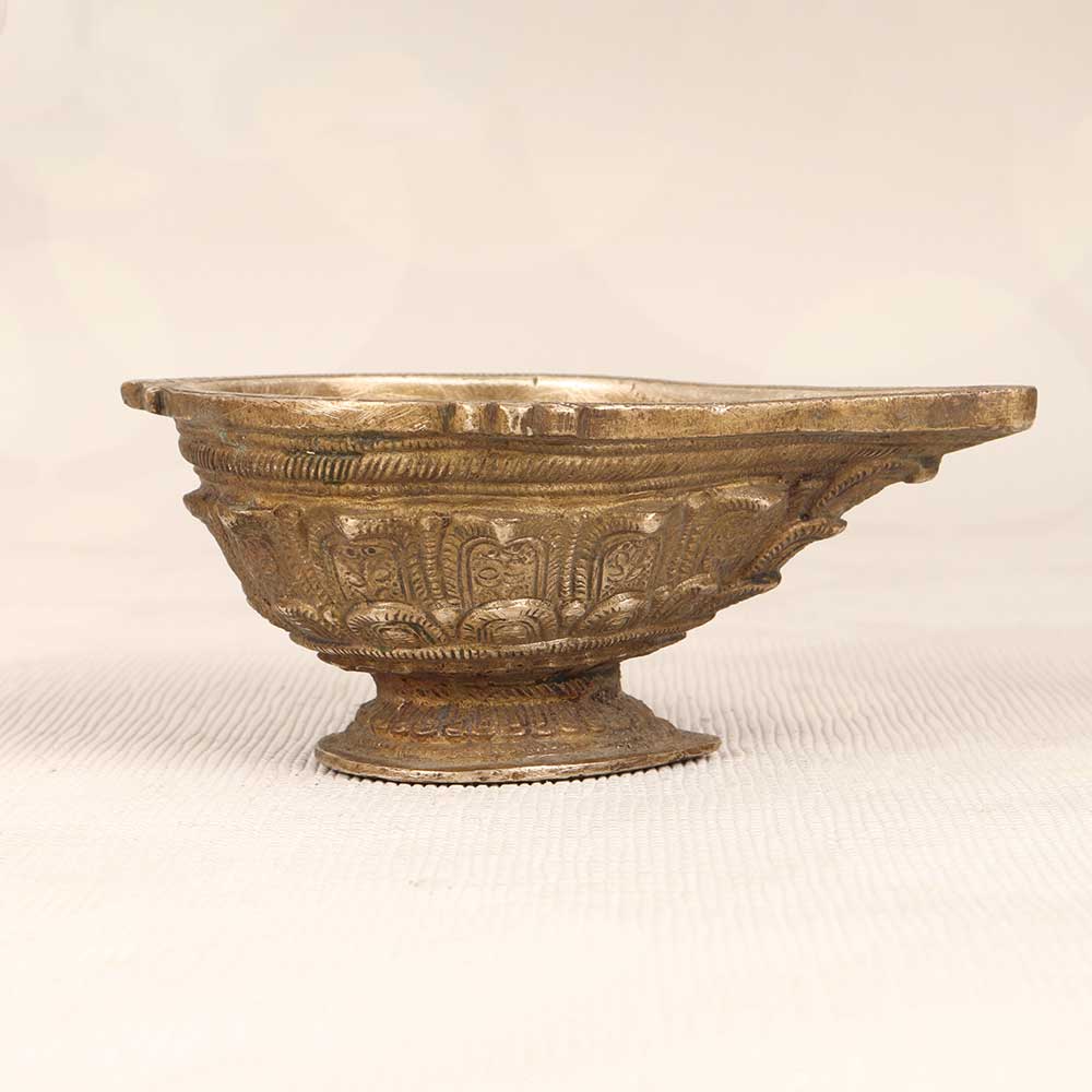 Step into the glow of old world charm with this stunning vintage brass oil lamp. Handcrafted in the rich artistic traditions of South India, this lamp brings the warmth and ambience of simpler times to any space. With its elegantly curved spout and handle, solid brass body, and etched floral motifs, it makes a statement whether lit or unlit. When night falls, fill the brass reservoir with mustard oil or ghee and light the wick to cast a cozy, flickering glow. The soft radiance is perfect for creating atmosphere during intimate dinners, reading beside on lazy Sundays, or winding down before bed. The lamp burns clean and bright for hours, requiring just occasional topping up of oil. If you love decor that tells a story, this lamp makes a meaningful addition to a living room, bedroom, or entryway. Its timeworn patina and handmade craftsmanship add artisanal appeal to both rustic and modern spaces. An illuminating way to bring the tranquility of ancient tradition into your home.