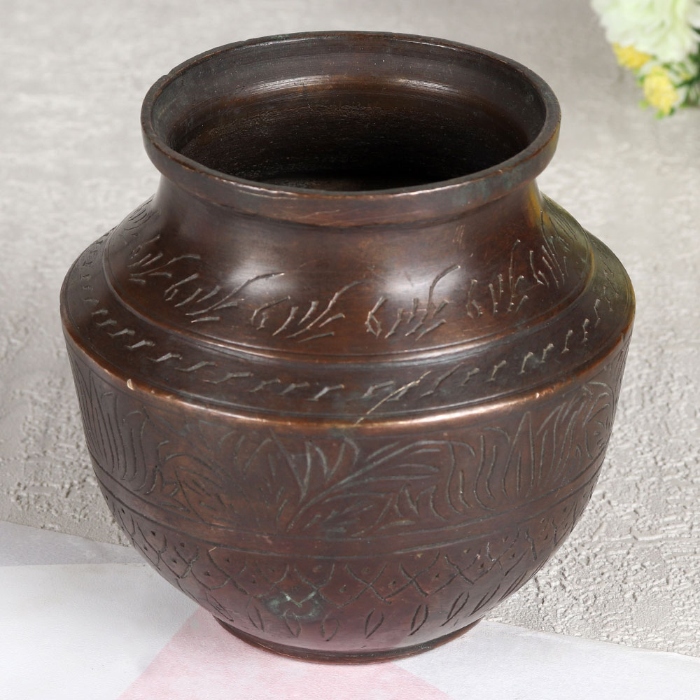 Enhance your decor with the timeless elegance of our Vintage Brass Flower Pot. Crafted by highly skilled Indian artisans with meticulous attention to detail, this exquisite piece embodies the rich heritage of craftsmanship. The flower pot boasts a stunning antique dark brown finish, enhancing the allure of its intricate engravings. Each stroke tells a story, making it a true work of art. Its premium quality brass construction ensures longevity and durability, allowing it to grace your home, office, restaurant, hotel, cafe, or shop with its beauty. This versatile flower pot serves multiple purposes. Use it as a striking decoration piece to add a touch of vintage charm to any setting. Its cultural significance extends to rituals, havan, and prayer ceremonies, making it an essential part of your sacred space. Whether you're an avid collector or a curator of exhibitions, this brass flower pot is a captivating addition to your vintage collection. Its timeless appeal and cultural significance make it an ideal gift for your loved ones on special, festive, or auspicious occasions, symbolizing your appreciation for tradition and artistry.