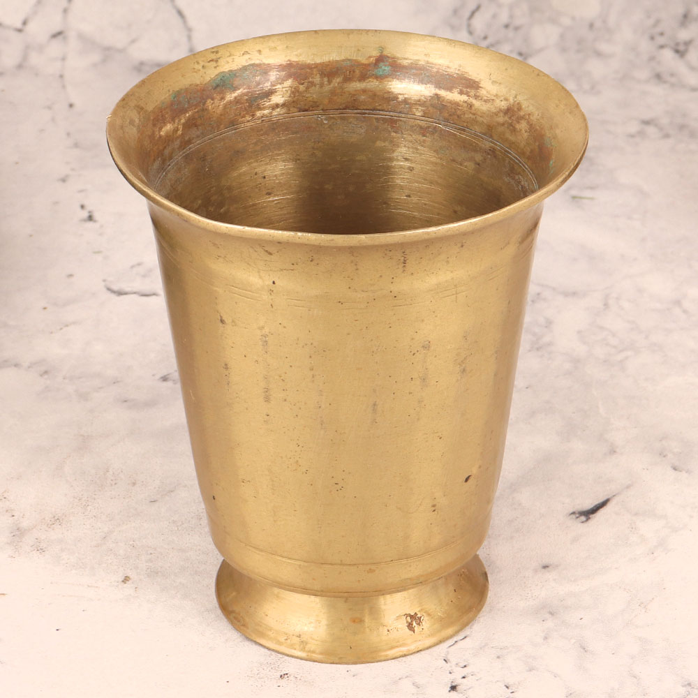 Buy a Vintage Brass Glass online that is a true testament to the craftsmanship of skilled Indian artisans from South India. Meticulously handcrafted, this piece boasts an antique golden finish, evoking the timeless charm of a bygone era. Forged from high-quality brass, this glass holds a significant place in traditional Indian rituals such as Pooja, Havan, and various ceremonies. Its versatile design makes it equally suitable for adorning your home, office, restaurant, hotel, shop, or cafe, adding a touch of regal elegance to any space. Beyond its spiritual utility, this brass glass also doubles as a charming flower pot, breathing life into your surroundings. It's a must-have for vintage collectors, a captivating piece for exhibition displays, and a thoughtful gift for loved ones on special, festive, or auspicious occasions.