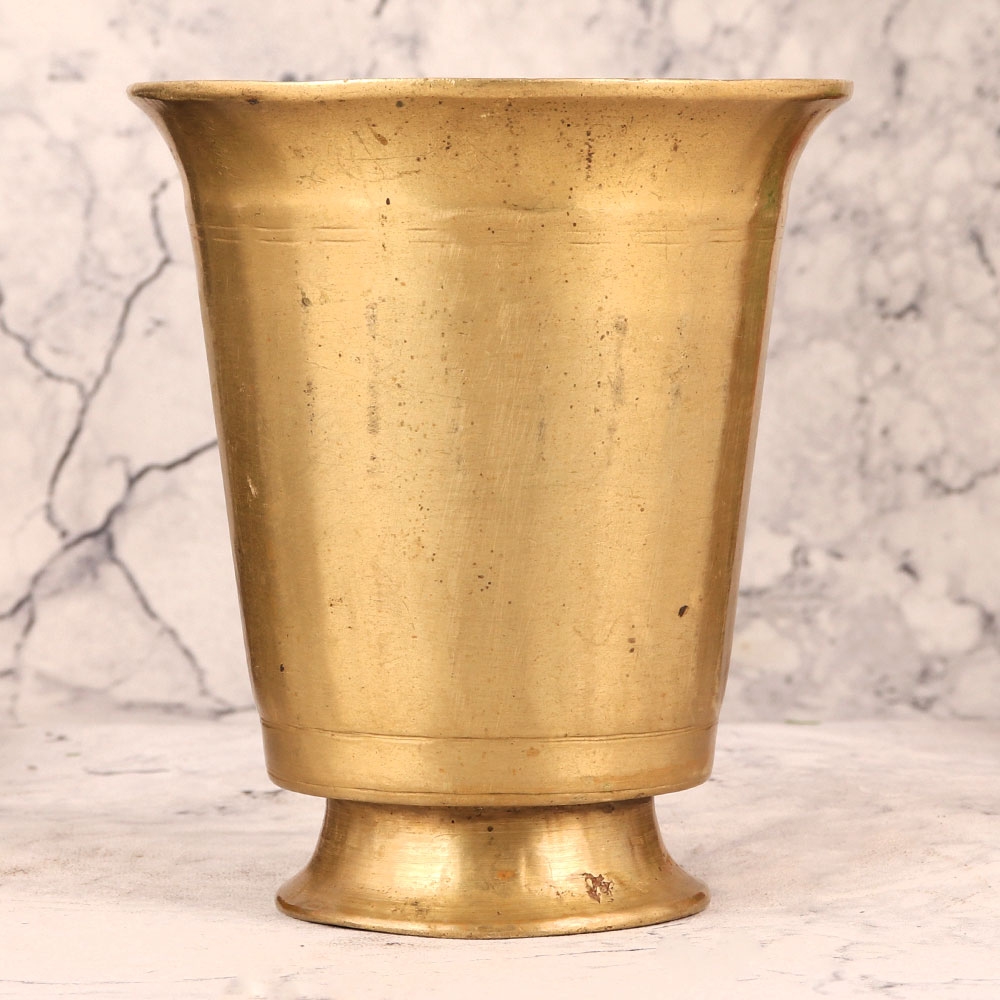 Buy a Vintage Brass Glass online that is a true testament to the craftsmanship of skilled Indian artisans from South India. Meticulously handcrafted, this piece boasts an antique golden finish, evoking the timeless charm of a bygone era. Forged from high-quality brass, this glass holds a significant place in traditional Indian rituals such as Pooja, Havan, and various ceremonies. Its versatile design makes it equally suitable for adorning your home, office, restaurant, hotel, shop, or cafe, adding a touch of regal elegance to any space. Beyond its spiritual utility, this brass glass also doubles as a charming flower pot, breathing life into your surroundings. It's a must-have for vintage collectors, a captivating piece for exhibition displays, and a thoughtful gift for loved ones on special, festive, or auspicious occasions.