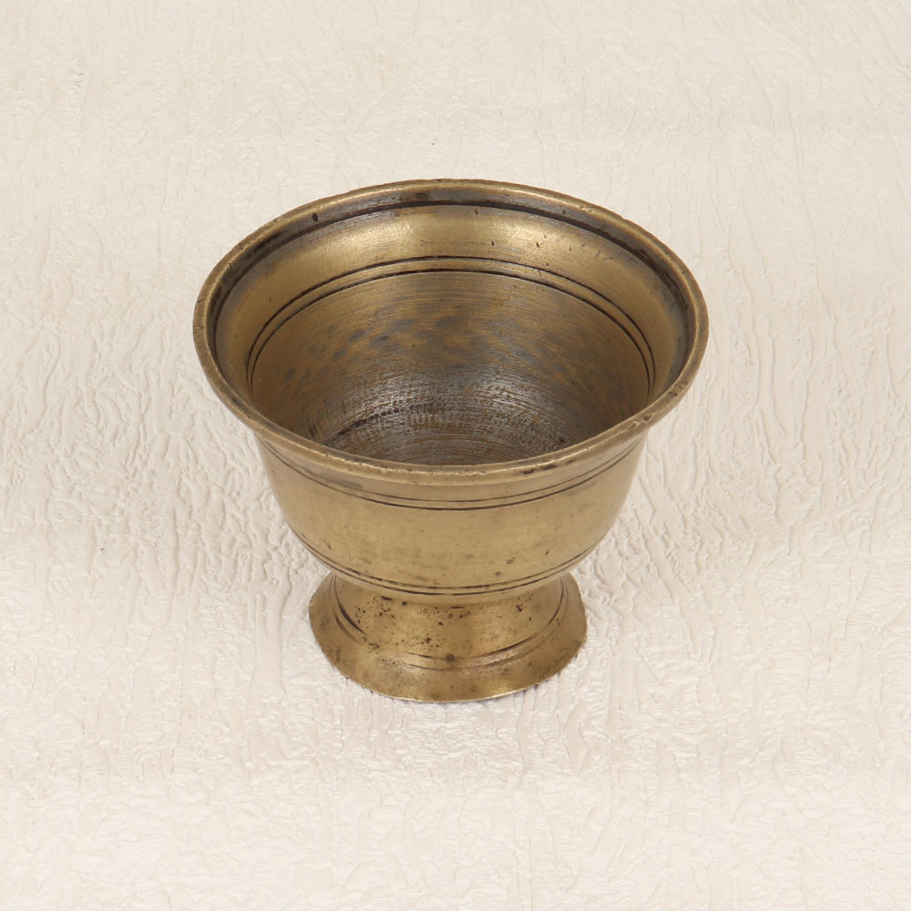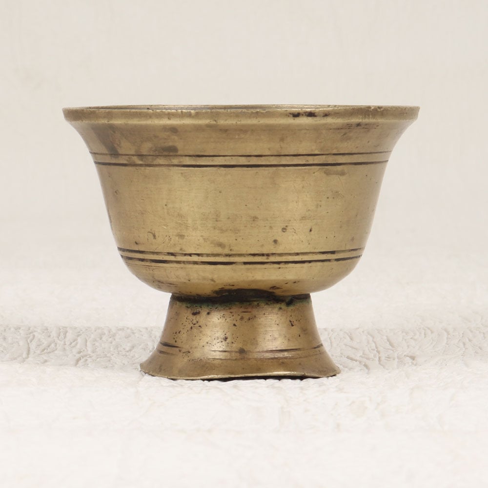 A Vintage Brass Kumkum Bowl with Base Stand that is a timeless piece meticulously handcrafted by skilled Indian artisans in the revered South Indian art tradition. Crafted from high-quality brass, this sacred bowl is an epitome of elegance, designed to enhance the spiritual ambience during prayers, rituals, and havans. Featuring an antique brown finish, this kumkum bowl exudes a vintage charm that seamlessly blends with any decor. Its intricate detailing showcases the artisan's dedication to preserving the cultural and artistic heritage of South India. The bowl, specifically designed to hold kumkum tilak, becomes a symbolic vessel for spiritual offerings. Versatile in its application, this brass kumkum bowl is a perfect addition to your home, office, restaurant, hotel, or cafe prayer room, elevating the sacred atmosphere. Beyond its religious significance, the bowl serves as an exquisite decorative piece, adding a touch of antiquity to any space. Ideal for collectors, it can be a precious addition to your vintage collection. Moreover, this Vintage Brass Kumkum Bowl makes for a thoughtful and meaningful gift for your loved ones on special, festive, or auspicious occasions, symbolizing blessings, tradition, and cultural richness.
