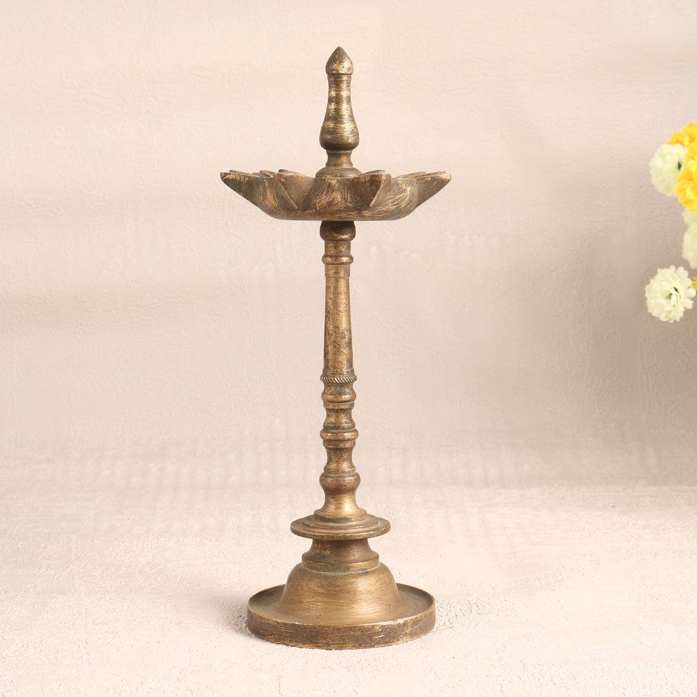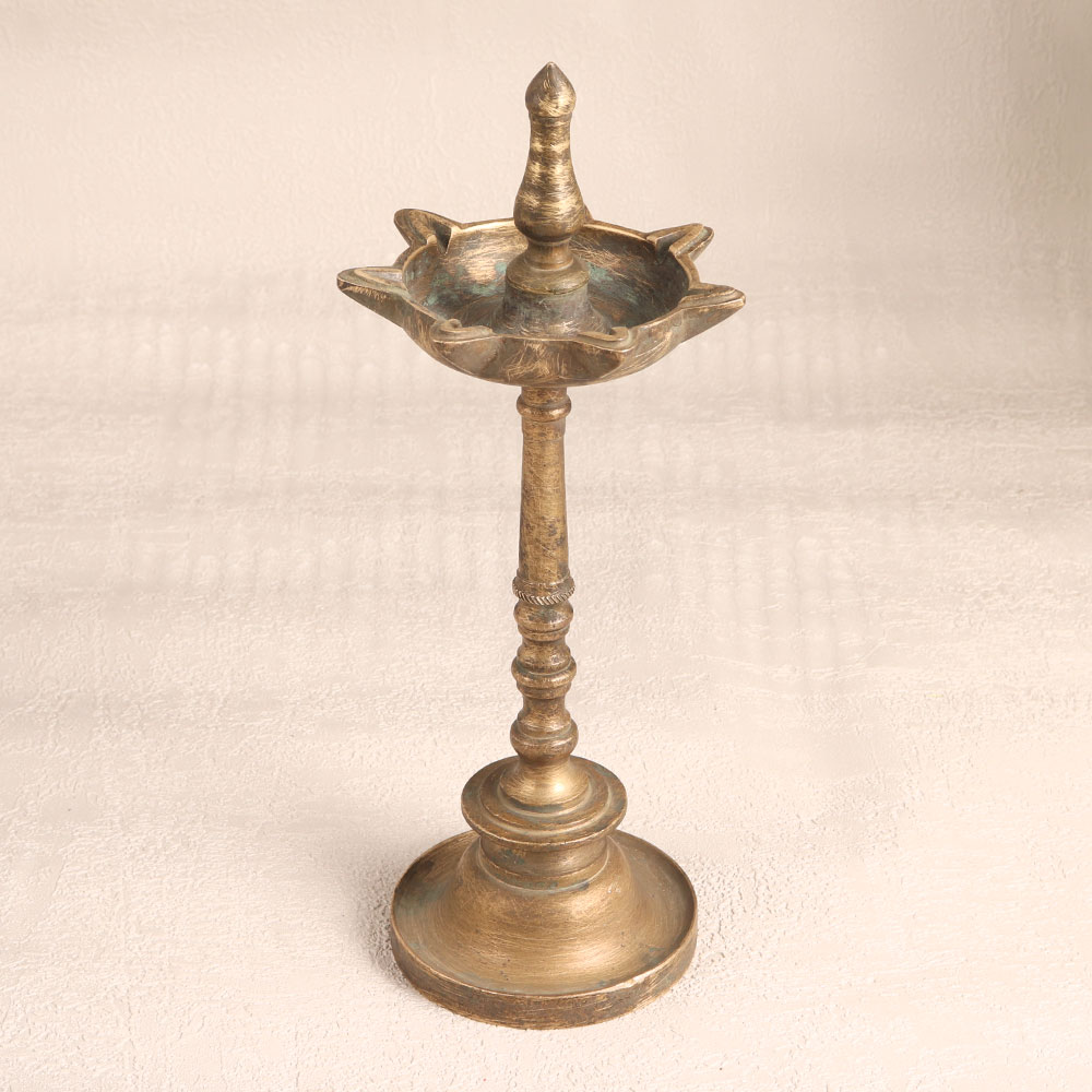 This Vintage Brass Oil Lamp is a stunning embodiment of South Indian artistry. Handcrafted by highly talented Indian artisans, this lamp showcases their craftsmanship and attention to detail. Its antique brown finish adds a touch of old-world charm and elegance. This lamp is not just a decorative piece, it's a functional work of art. Featuring seven jyots (lamps), it can be lit using traditional materials like mustard oil or ghee and cotton wicks. The warm, flickering glow it produces creates a soothing and inviting atmosphere, making it perfect for use at home, office, hotels, cafes, shops, restaurants, or prayer rooms. Whether placed as a centerpiece or displayed in a vintage collection or exhibition, this lamp stands out as a timeless masterpiece. It's ideal for use during prayers, auspicious occasions, or even as a thoughtful gift for your loved ones during special, festive, or celebratory moments.