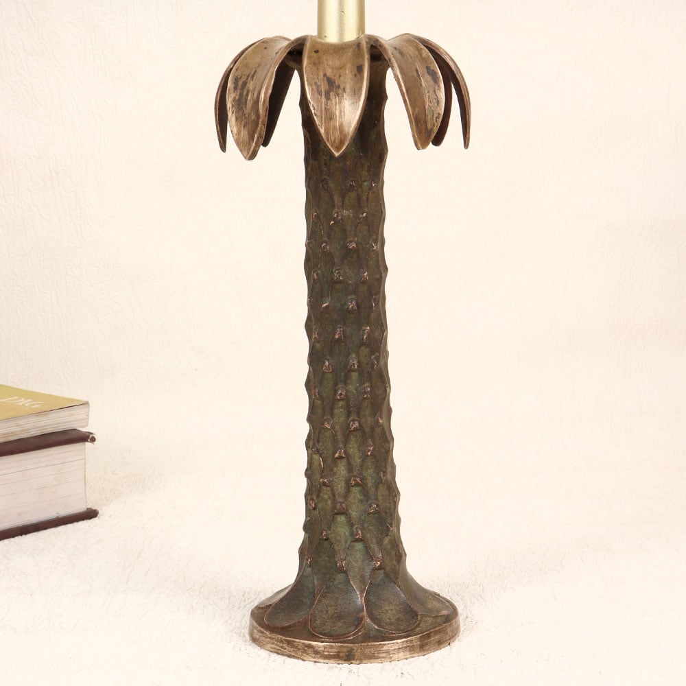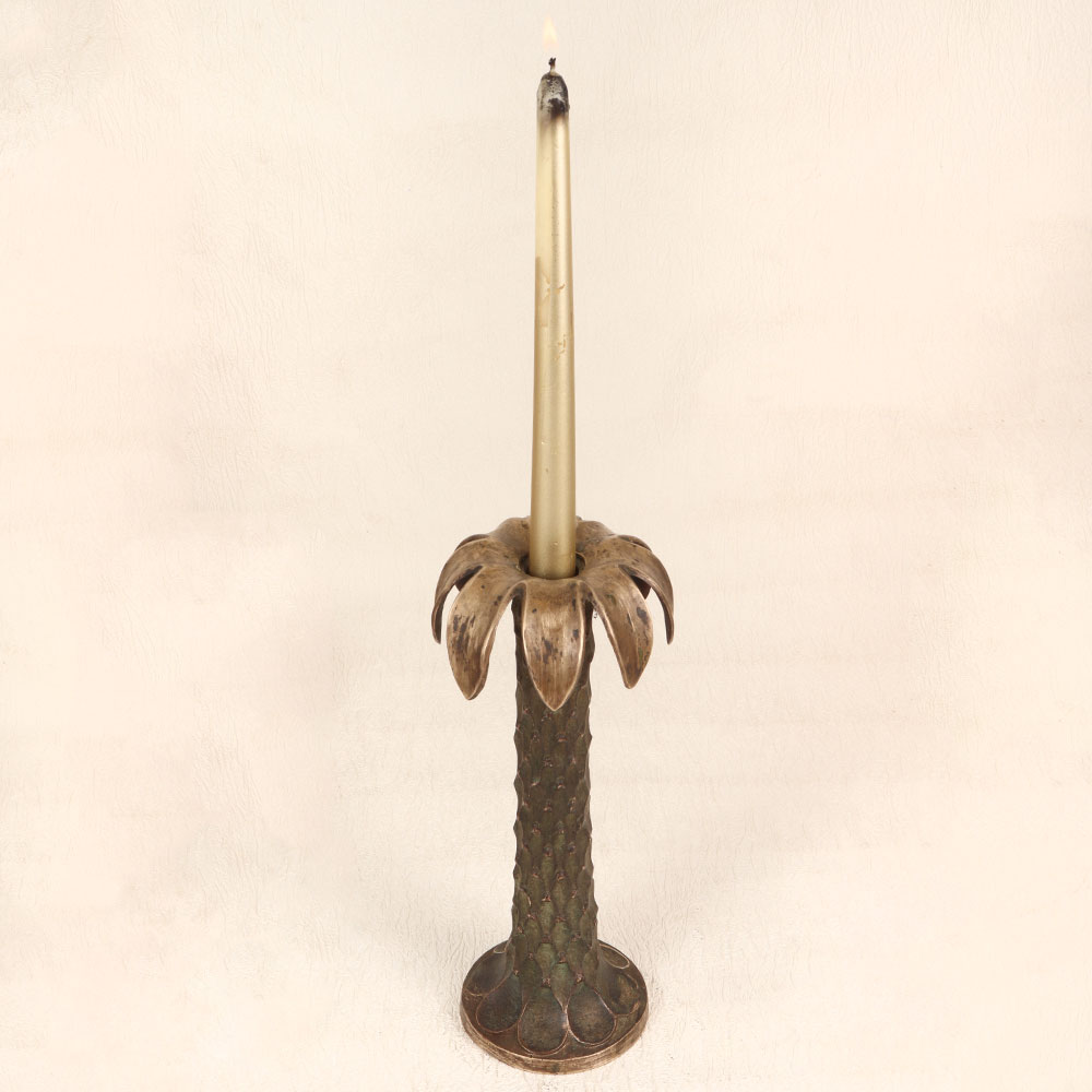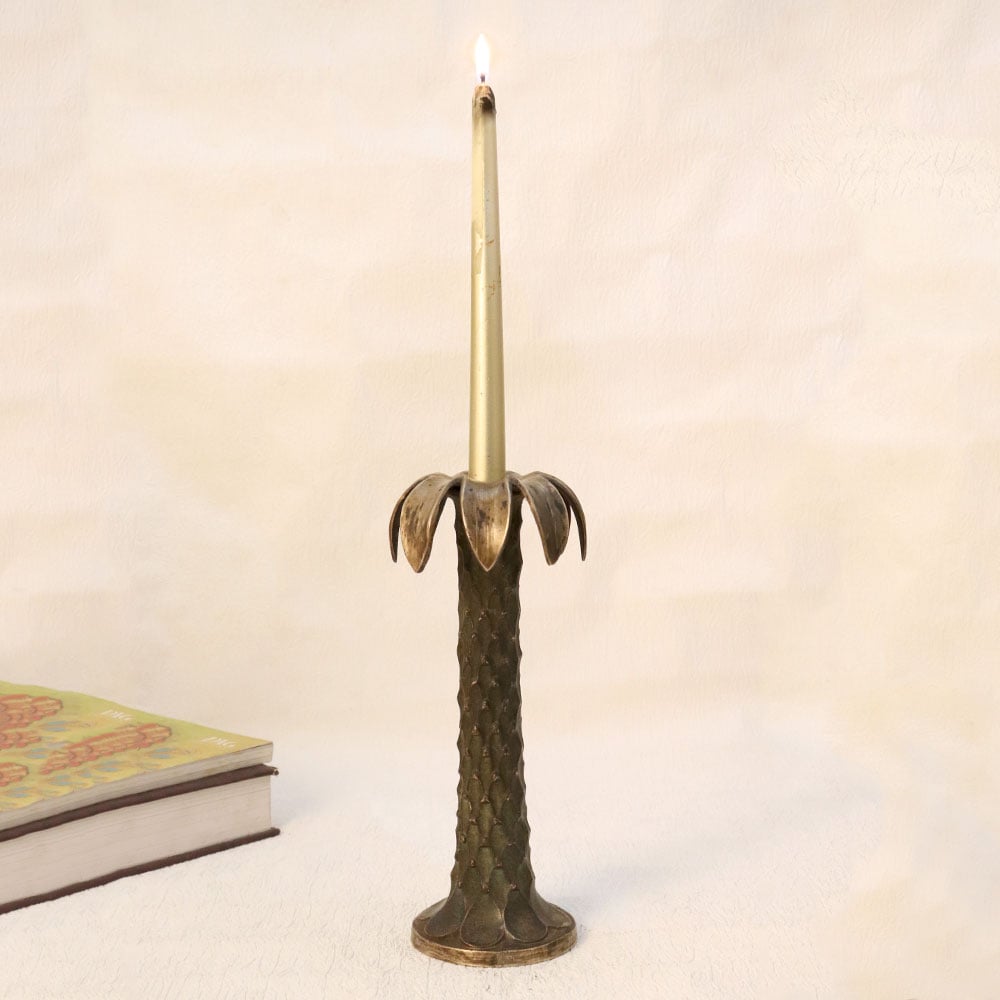 Adorn your living room with the timeless charm of our Vintage Brass Candle Stand that is crafted in the shape of a majestic palm tree. This exquisite piece boasts an antique brown finish, adding a touch of old-world elegance to any space. Meticulously handmade by talented artisans in the revered English Art tradition, this candle stand is a testament to craftsmanship and quality. Made from high-quality brass, the stand exudes durability and sophistication. Its versatile design allows it to be hung in various settings, whether at home, office, restaurant, hotel, or cafe, enhancing the ambiance with its warm, nostalgic glow. This piece is not merely a decor item but a collector's delight, seamlessly blending into vintage collections. Celebrate special, festive, or auspicious occasions by gifting this unique candle stand to your loved ones, symbolizing timeless beauty and craftsmanship.