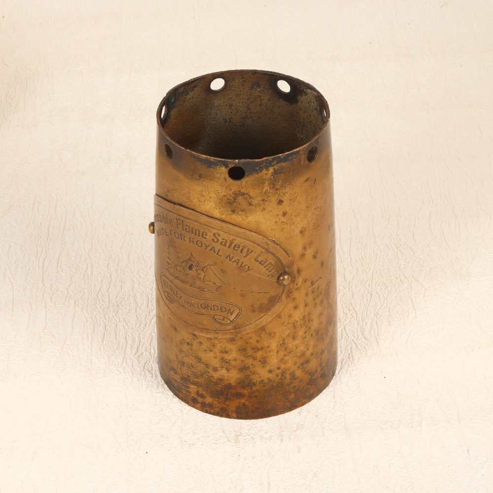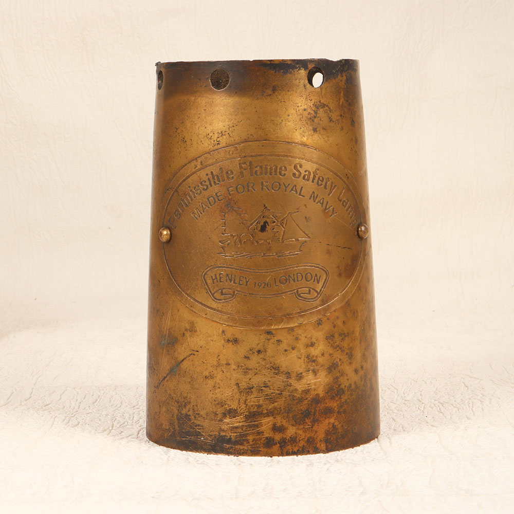 Buy a vintage brass lamp part online that seamlessly blends functionality with timeless elegance. Crafted in a distinctive pot-like shape, this exquisite artefact features remarkable engravings that tell a story of its rich heritage. The words "Permissible Flame Safety Lamp," "Made for Royal Navy," and "Henley 1920 London" evoke a sense of authenticity and historical significance, making it a unique and cherished addition to any space. Handmade by skilled artisans in the renowned English Art tradition, this brass lamp part boasts a lustrous antique brown finish that accentuates its vintage appeal. Its versatility shines through, as it can double as a distinctive flower pot, adding a touch of sophistication to your home, office, restaurant, hotel, or cafe. The meticulous craftsmanship and attention to detail make it a standout piece in any setting, while its historical connections make it a valuable addition to any vintage collection. Embrace the opportunity to share the beauty of the past by gifting this remarkable piece to your loved ones on special, festive, or auspicious occasions.