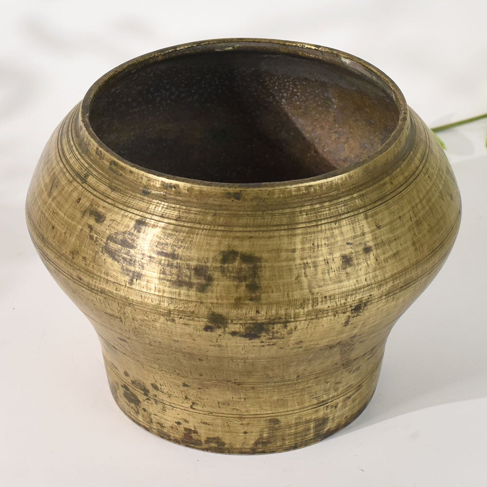 Enhance your home with the timeless charm of this vintage handmade brass pot, beautifully crafted with traditional techniques and aged to perfection. Its classic round shape, textured finish, and authentic patina give it a warm, rustic appeal that seamlessly complements modern, bohemian, ethnic, and antique interiors. Originally used as a holy vessel in traditional Indian households, this brass pot now makes a stunning flower pot, table decor accent, or decorative storage bowl. Hand-spun by skilled artisans, its imperfections, markings, and natural aging reflect its cultural history and handmade authenticity. Whether placed in a living room, entryway, meditation space, or garden corner, this brass pot adds a touch of heritage charm while serving as a beautiful base for fresh flowers, dried arrangements, greens, or decorative fillers. A versatile dcor piece, it works wonderfully for festive decoration, photo styling, or as a thoughtful gift for lovers of vintage and handcrafted artistry.
