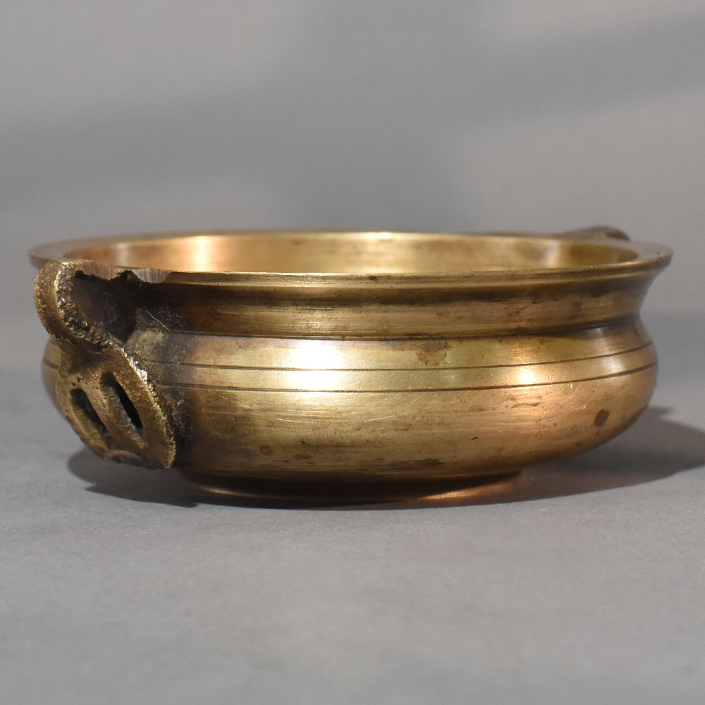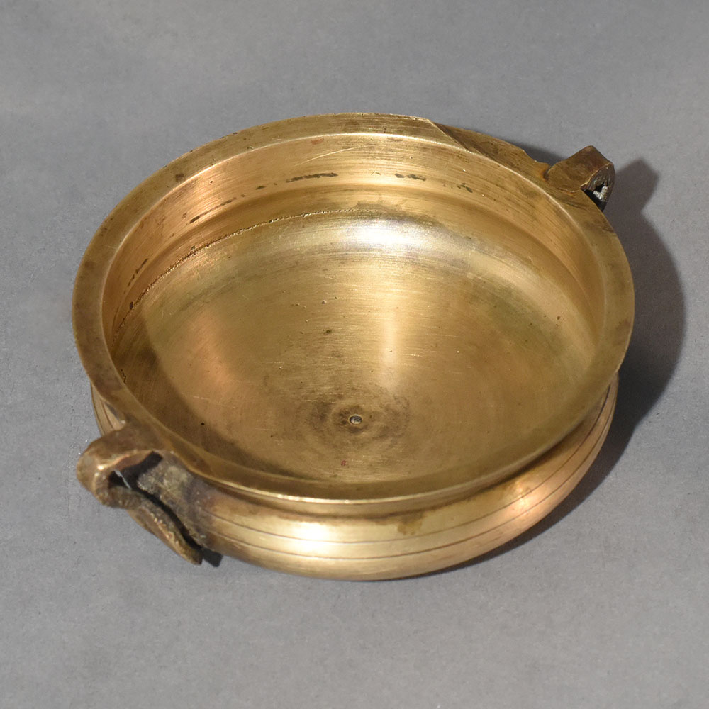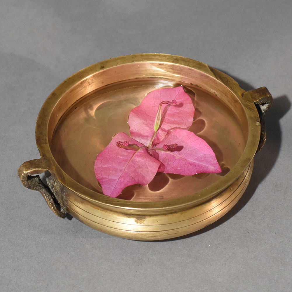 This vintage brass Urli pot is a refined expression of Himalayan metal artistry, traditionally used for ceremonial and decorative purposes in mountain homes and temples. Hand-shaped from solid brass, the Urli features a wide, open mouth and a gently rounded body, allowing flowers, petals, and floating diyas to be displayed with graceful balance. The surface bears natural patina, subtle discoloration, and age marks that speak to decades of use and hand-polishing, making every piece visually unique. The twin side handles are thick, rugged, and organically shaped, reflecting the utilitarian beauty common to Himalayan household vessels. Unlike polished modern decor, this Urli carries an earthy warmth, making it ideal for serene spaces such as meditation corners, prayer rooms, entryways, or festive floral arrangements. When filled with water and seasonal blooms like marigolds, lotus petals, or roses, the brass subtly reflects light, enhancing the colors and creating a calm, grounding presence. This Urli pot blends seamlessly into traditional Indian interiors while also standing out in contemporary homes as a statement artifact. It is not just a decorative bowl, but a heritage object that preserves the aesthetics of Himalayan daily life and ritual practice.