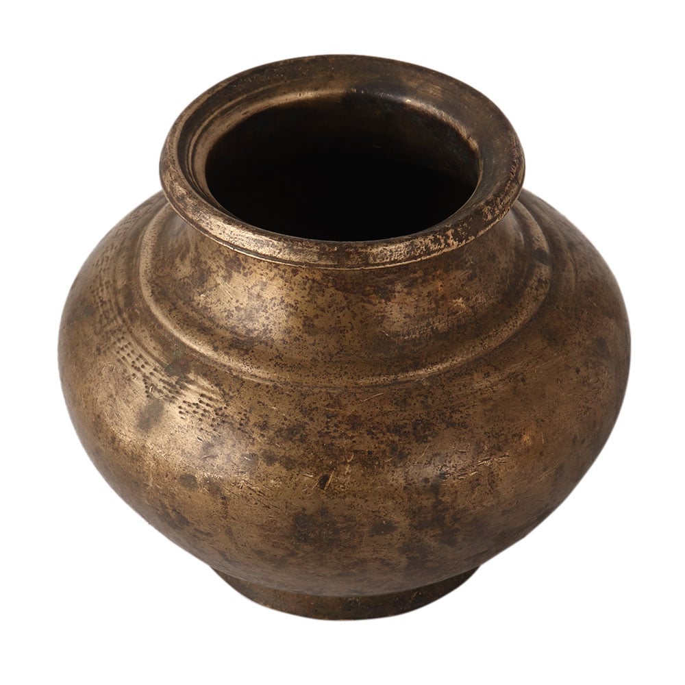 The vintage holy water pot is made of bronze. It is handmade by local Indian craftsmen. It has a faded brownish appearance. You can use it as a flower pot or stage decoration.