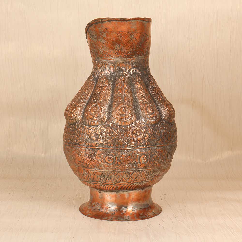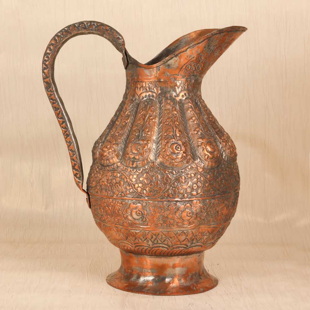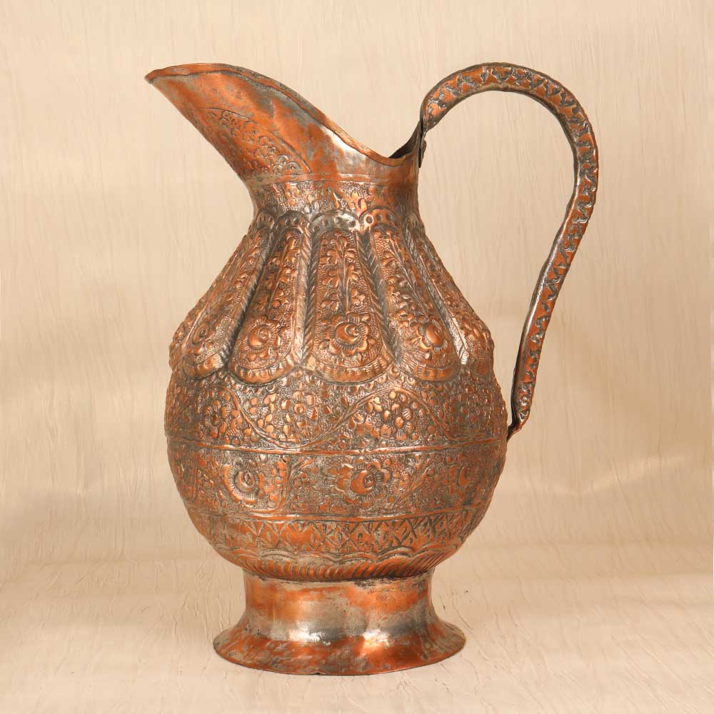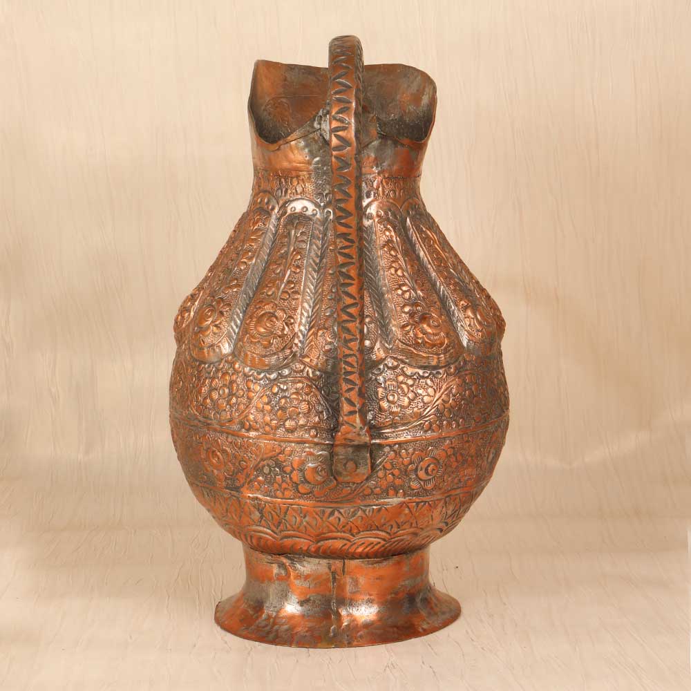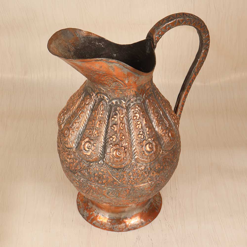 Add a touch of timeless elegance to your home with this stunning vintage copper jug. Handcrafted using traditional techniques, this jug features intricate engraved motifs and patterns, a testament to fine Islamic artistry. This special jug will transport you to ancient bazaars and markets of the Middle East. The engraved motifs reflect advanced metalworking skills passed down through generations of skilled artisans. Whether displayed on a shelf, countertop or dining table, this copper jug lends a exotic, sophisticated touch to any space. For collectors and designers alike, this jug is a rare find. The vintage styling and engraved artwork make it a meaningful showpiece. Add a touch of timeless beauty and handcrafted appeal to your home decor with this copper jug.