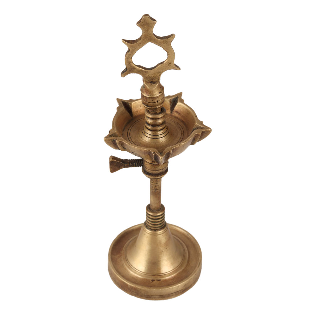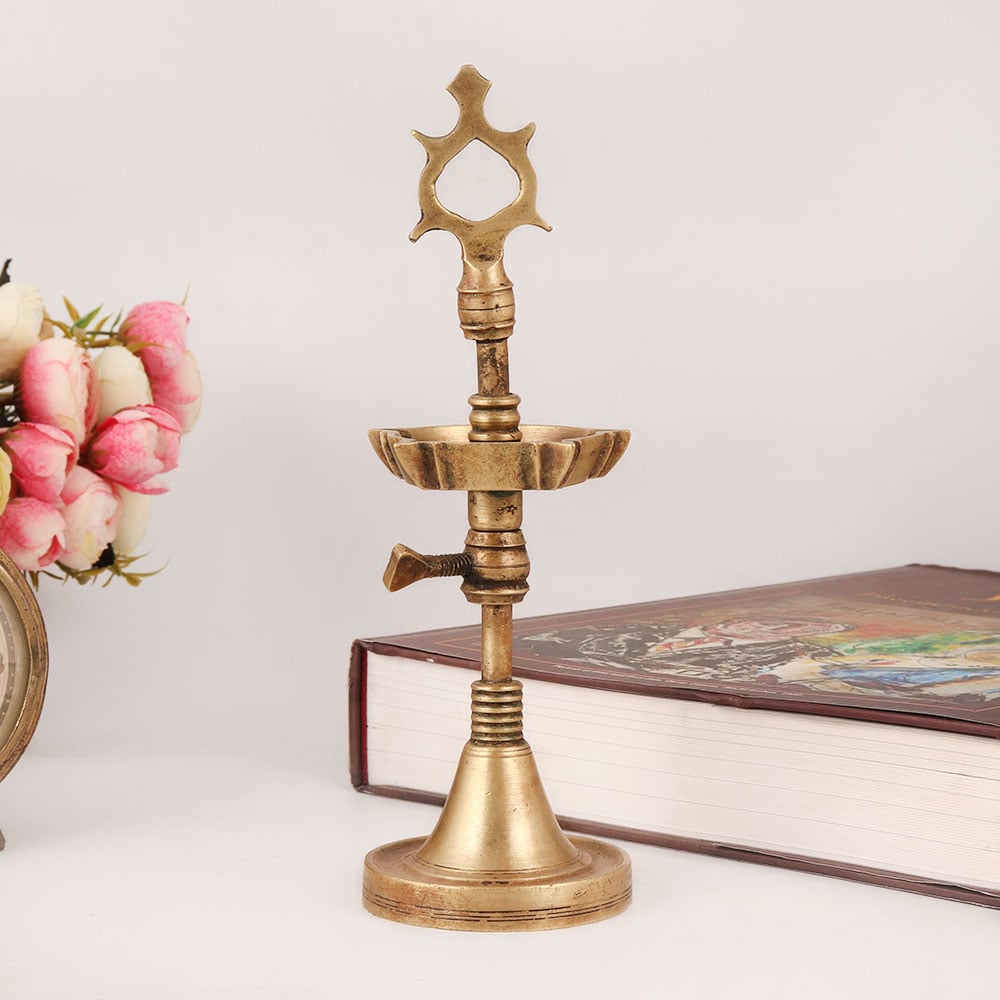 A Vintage Brass Oil Lamp with 5 Jyots that emanates timeless beauty and traditional charm. Crafted with utmost precision by highly skilled Indian artisans, this lamp showcases their exceptional craftsmanship and attention to detail. The lamp features a rich brown finish and is made from high-quality brass, ensuring its durability and captivating appearance. With its elegant design, it effortlessly catches the eye and becomes a stunning addition to any space. The lamp is designed to hold five cotton wicks, which can be lit using either mustard oil or desi ghee. Its purpose extends beyond mere decoration, as it holds a significant role in religious rituals such as aarti at temples and Pooja ceremonies at home, office, or any auspicious occasion. When lit, it spreads a warm, inviting glow, creating a serene and positive ambiance. What sets this lamp apart is its adjustable height, allowing you to customize its display according to your preference or the occasion. Moreover, this lamp serves as an incredible gift option for your loved ones on special occasions, festivals, or auspicious events. Its intricate design, cultural significance, and ability to radiate positive vibes make it a truly memorable and cherished present for family, friends, or relatives.