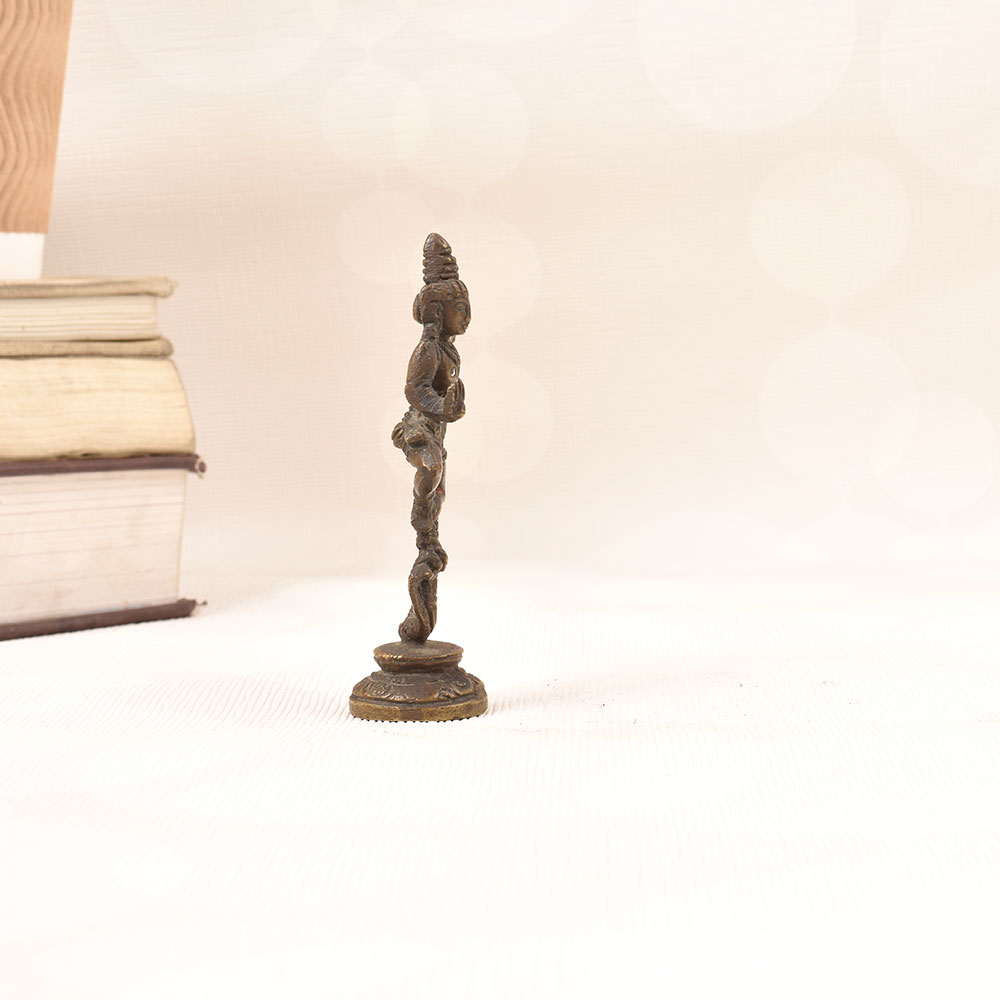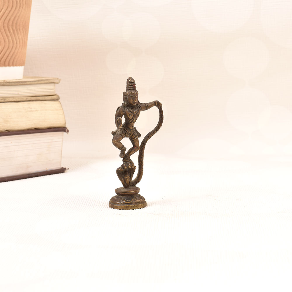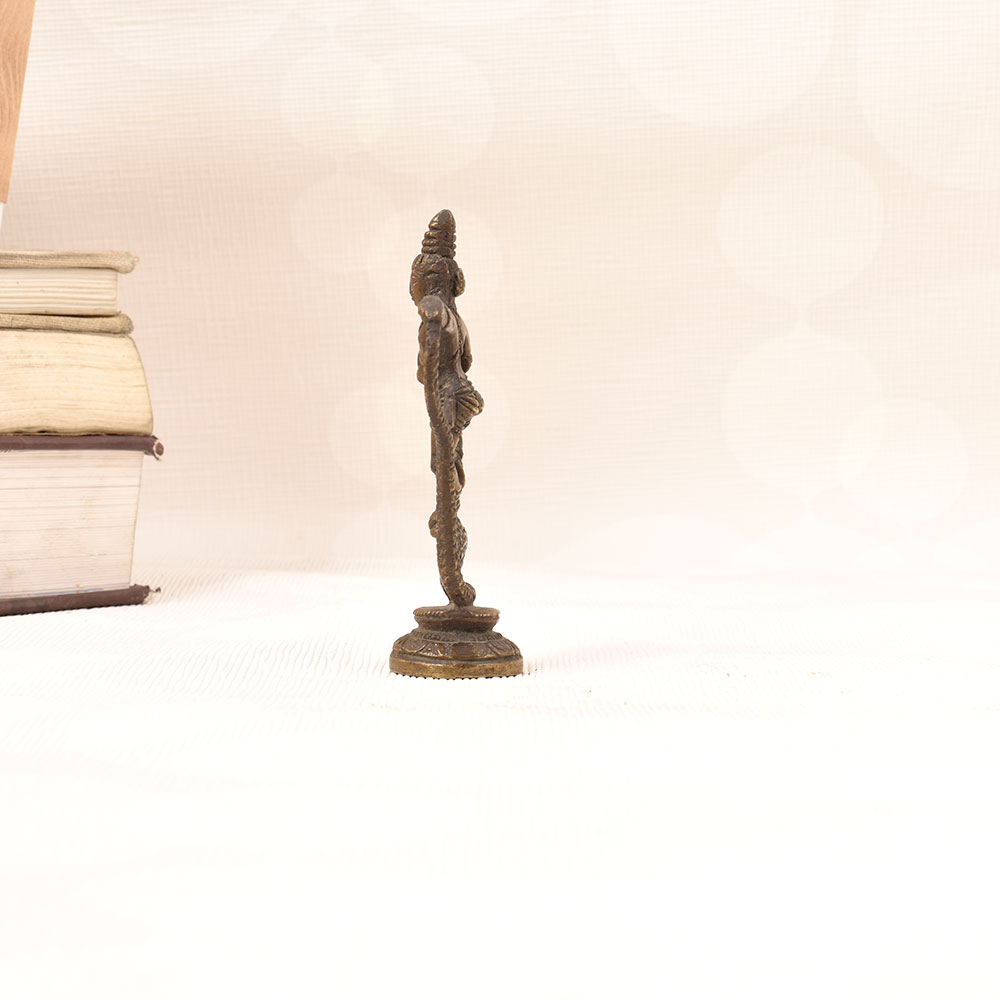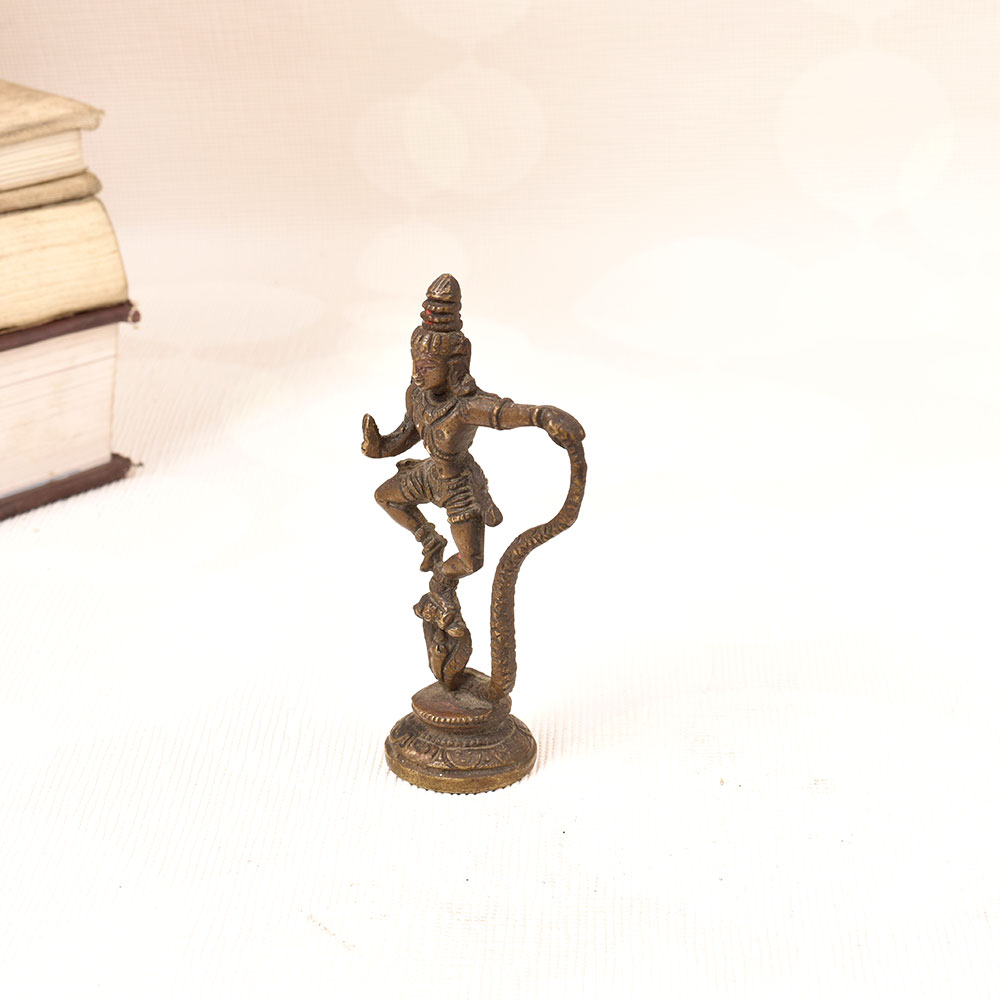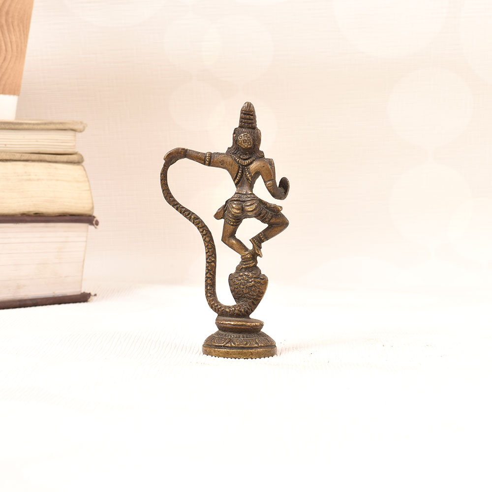 Prepare to be mesmerized by the captivating beauty and timeless elegance of this exquisite brass Lord Krishna statue. Meticulously crafted, this stunning piece showcases the revered deity dancing gracefully atop a coiled cobra, a symbolic representation of the triumph of good over evil. Elevate your living space with the mesmerizing presence of this brass Lord Krishna statue. As the focal point of your décor, this captivating piece will inspire awe and reverence, transporting you to the divine realms of Hindu mythology. Embrace the timeless beauty and rich symbolism of this iconic figure, and let it infuse your home with a sense of harmony, enlightenment, and the triumph of righteousness. Whether you're a collector of fine art, a devotee of Hindu culture, or simply seeking to enhance your interior with a statement piece, this brass Lord Krishna statue is a must-have addition to your home. Showcase your appreciation for the divine and let this exquisite work of art elevate your living space to new heights of elegance and spiritual connection.