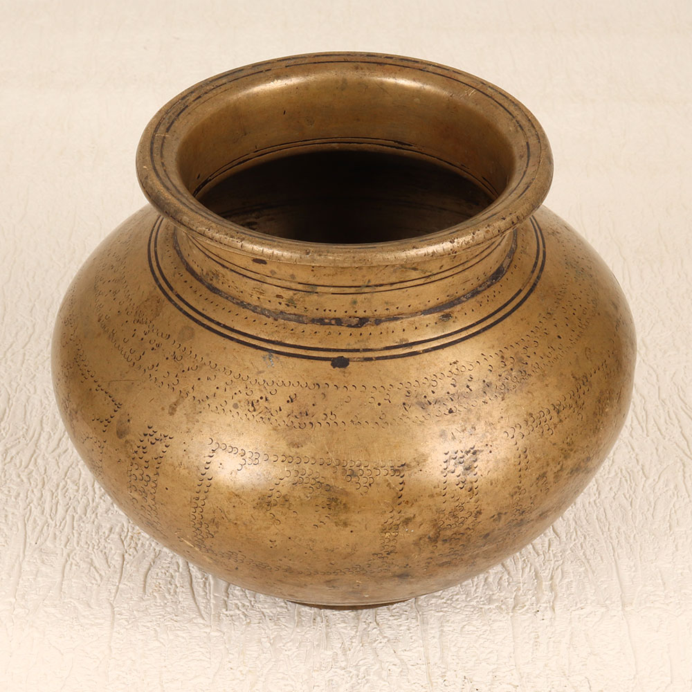 This Vintage Brass Holy Water Pot is a timeless embodiment of spirituality and craftsmanship. Imbued with the sacred aura of South Indian Art, this exquisite piece is meticulously handcrafted by highly skilled Indian artisans. Cast from high-quality brass, its antique brown finish exudes a charming patina, evoking a sense of heritage and reverence. This holy water pot serves as a cherished companion during prayers, rituals, and havans, cradling the sanctified waters with an air of grace. Versatile in its use, it seamlessly transitions to an indoor flower pot, adding an elegant touch to any space - be it your home, office, restaurant, hotel, or cafe prayer room. An exceptional addition to vintage collections, this pot narrates stories of tradition and devotion. Its thoughtful design invites admiration, making it an ideal gift for your loved ones on special, festive, or auspicious occasions.