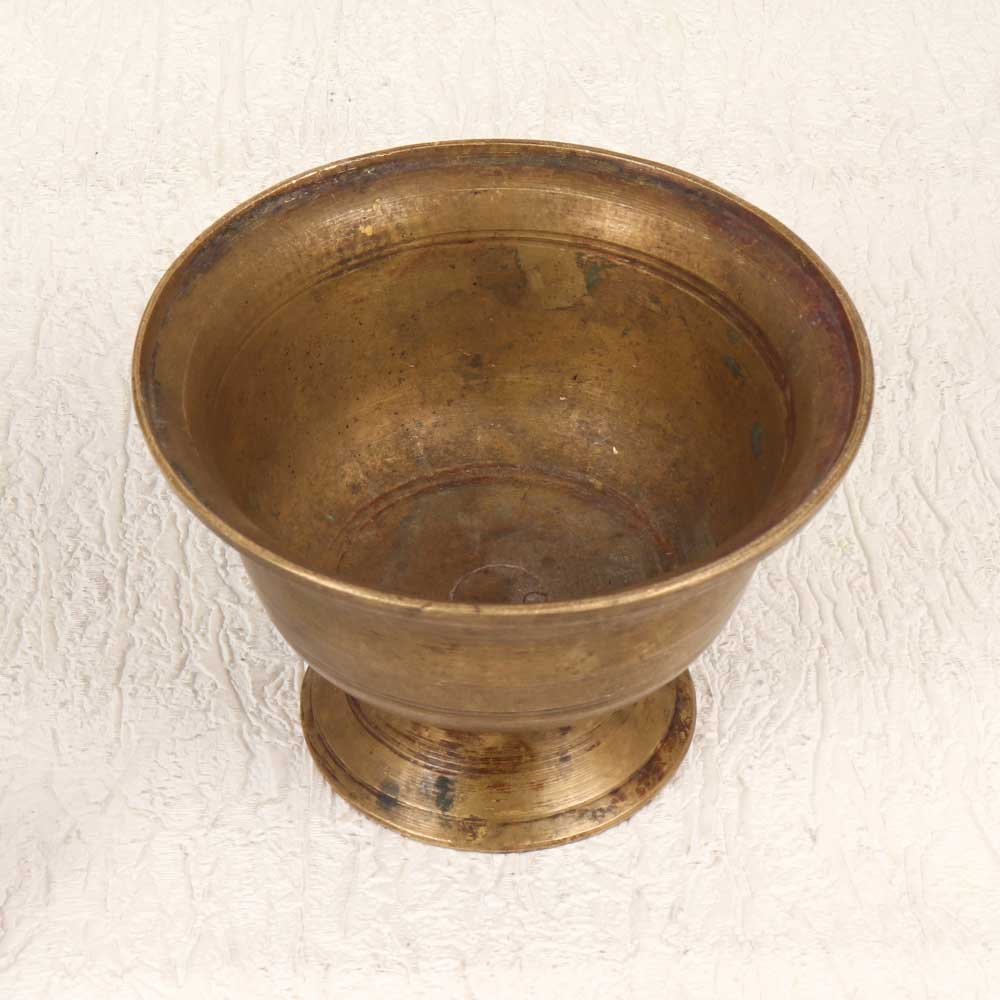 Add a touch of vintage beauty to your pooja with this eye-catching brass holy kumkum cup. Handcrafted from solid brass in a classic South Indian style, this cup elevates your worship space with its intricate design and smooth, rich finish. The cup features a wide, stable base and slender curved walls leading up to the rounded rim, allowing you to easily apply kumkum or holy ashes. This brass kumkum cup is perfect for creating an authentic, meaningful pooja experience. The vintage styling and artisanal craftsmanship add meaning and beauty to your rituals. Give your home mandir a touch of tradition with this wonderful accent piece.