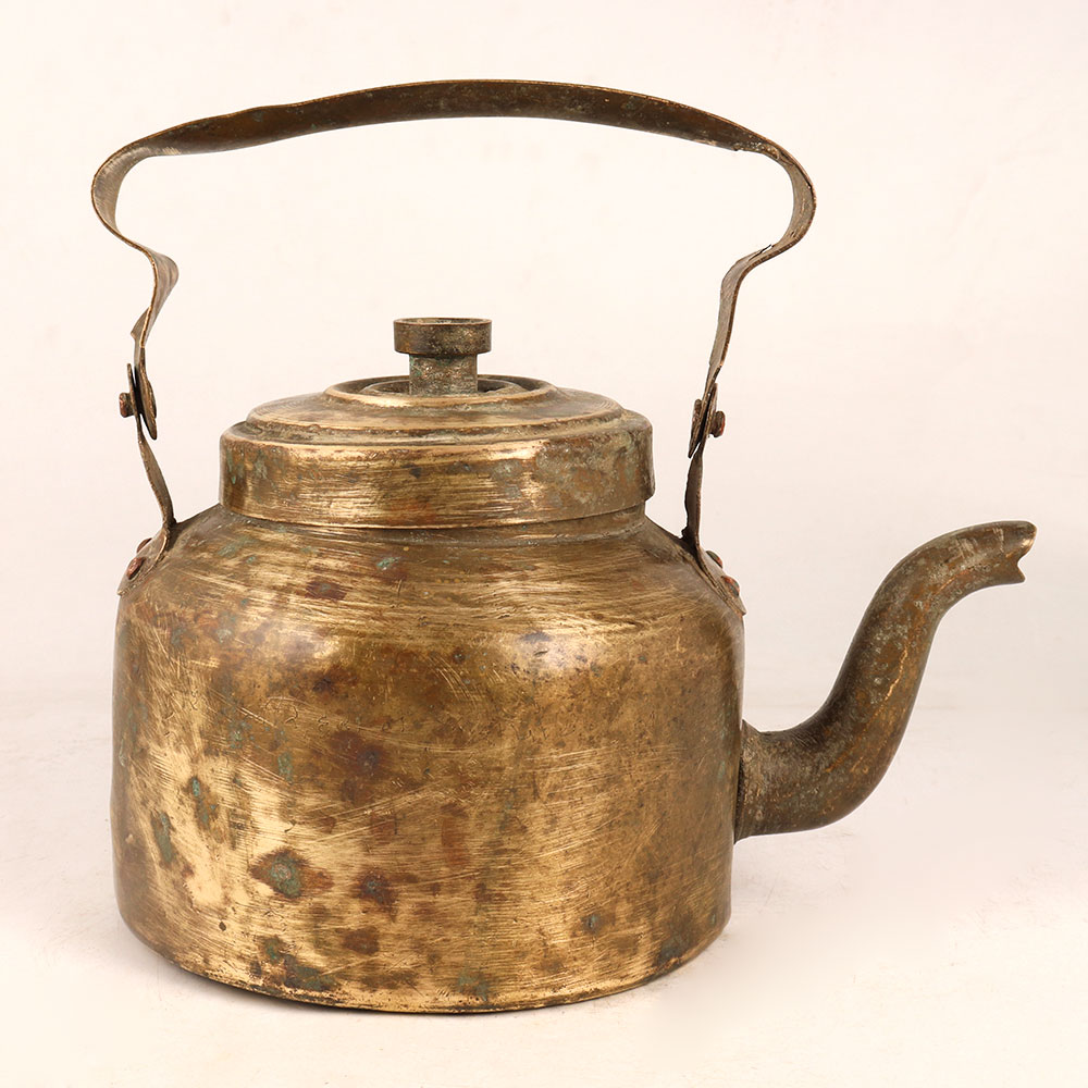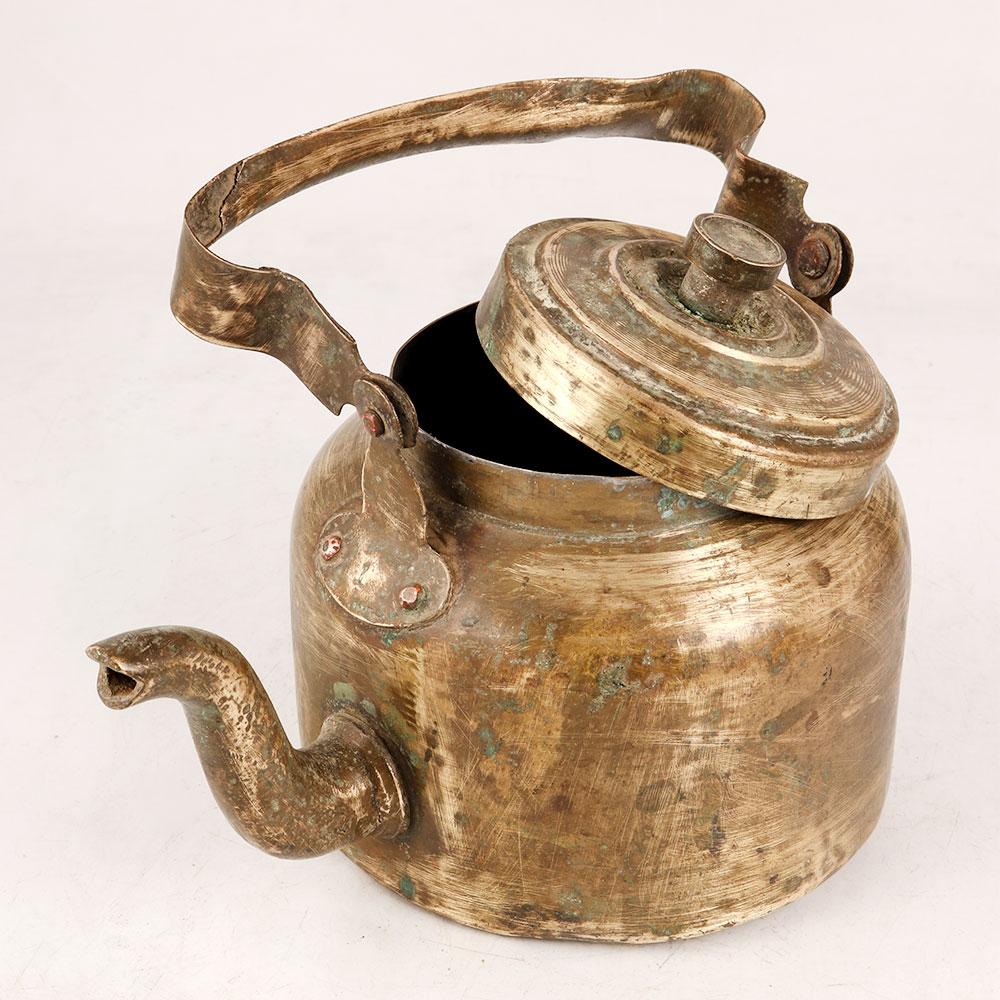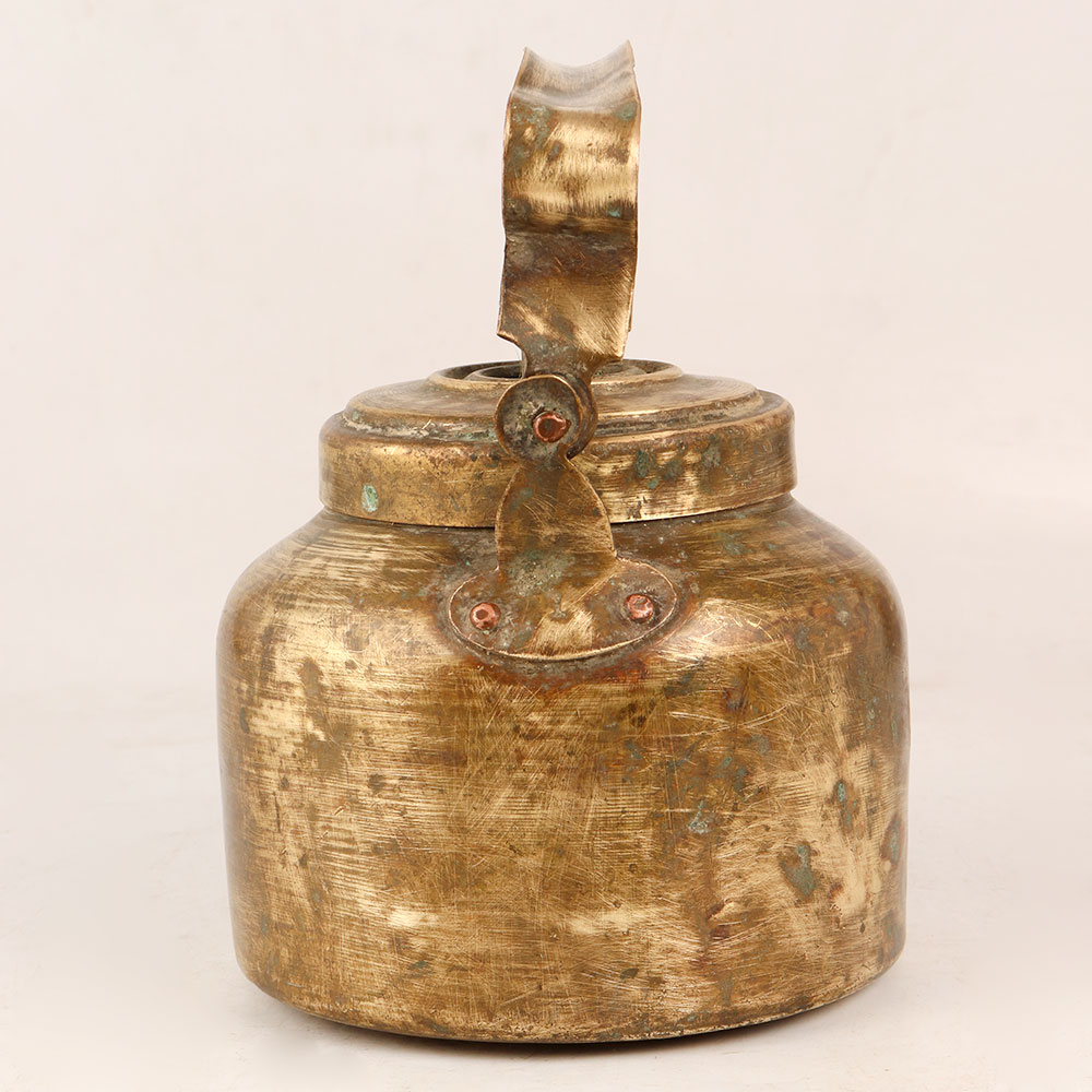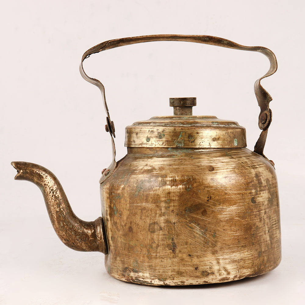Enhance your home decor with the timeless allure of this exquisite vintage brass kettle. Crafted with care by talented Indian artisans from Western India, this piece resonates with history and craftsmanship. The kettle, complete with a lid, handle, and spout, showcases the beauty of high-quality brass in an enchanting antique brown finish. Though previously cherished for its utility, this kettle's vintage charm suggests it be repurposed as a captivating decorative item. Its unique patina and handcrafted details make it a wonderful addition to any interior setting, be it a home, office, restaurant, hotel, or cafe. The kettle's aura evokes an era long past, making it an excellent choice for display at exhibitions or as a treasured addition to a vintage collection. Delight your loved ones on special occasions, festivals, or auspicious events by presenting them with this evocative piece. Its aesthetic appeal, combined with its rich history, lends a sense of authenticity and elegance to any space.