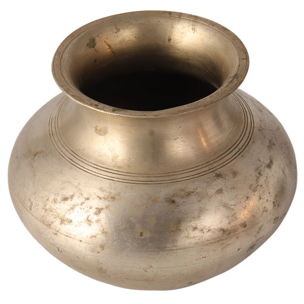 The vintage Indian Gangajal Kalash or water pot is made of white metal alloy. It has a flat bottom to hold on the surface. It can be used in Hindu rituals as a purna Kalash. When a kalash is filled with rice or water or gold coins and decorated with mango leaves so that the leaf touches the water, and a coconut is places on top, it is called a Purna Kalash. An ideal gift for your dear ones.