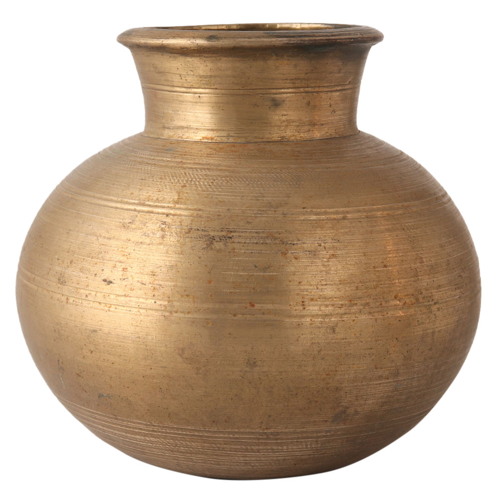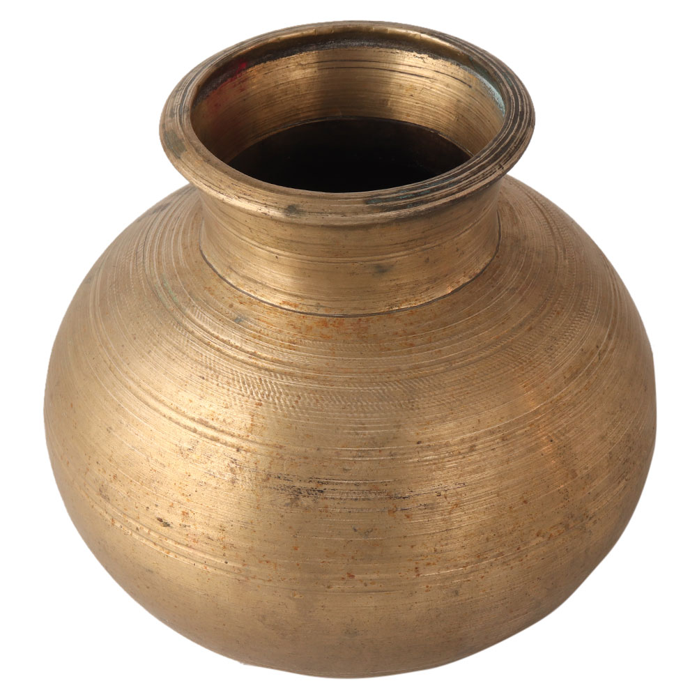 This vintage holy water pot is engraved with a pattern of lines. It is handmade by skilled Indian artists. It is made of Brass. It is used in Hindu wedding ceremonies, worship of dieties, sun pooja, etc. Decorate your home with this beautiful pot.