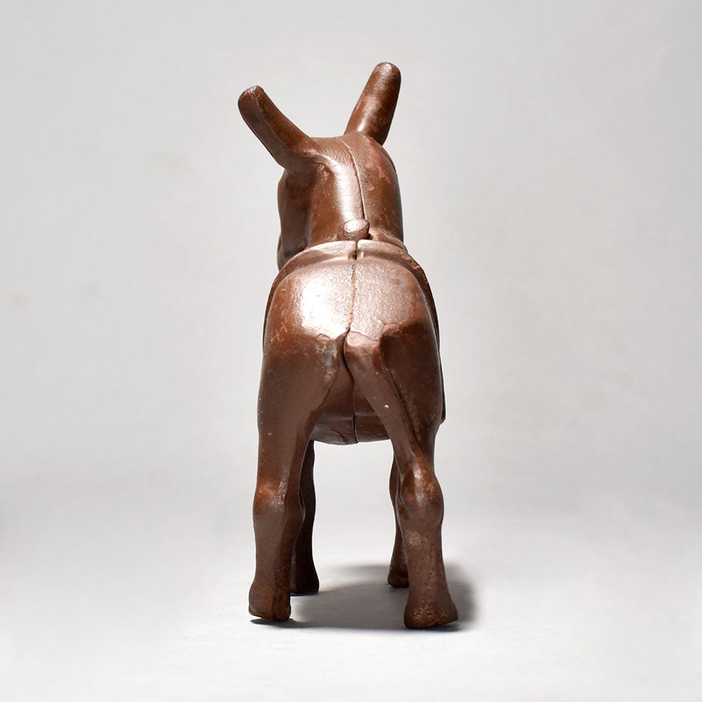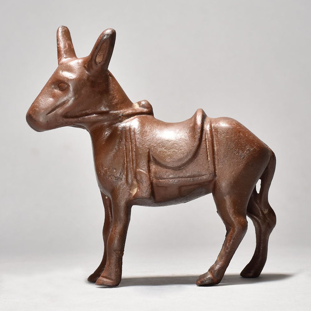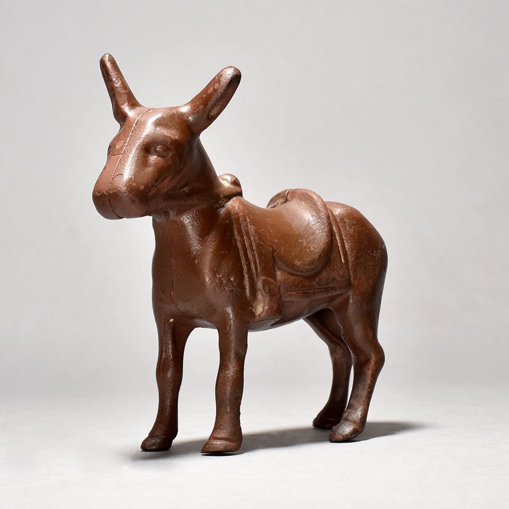 This vintage iron donkey statue is a timeless collectible that brings rustic charm and cultural heritage into any space. Crafted with attention to detail, the figurine beautifully captures the strength and simplicity of a donkey, complete with saddle details, making it a striking decorative piece. Perfect for antique collectors, farmhouse décor enthusiasts, or those who appreciate handcrafted artistry, this iron statue adds both history and character to your home or office. Its durable iron construction ensures longevity, while the vintage patina enhances its old-world appeal. Display it on shelves, mantels, or desks to create a unique focal point. A rare find for lovers of traditional craftsmanship and unique art pieces.