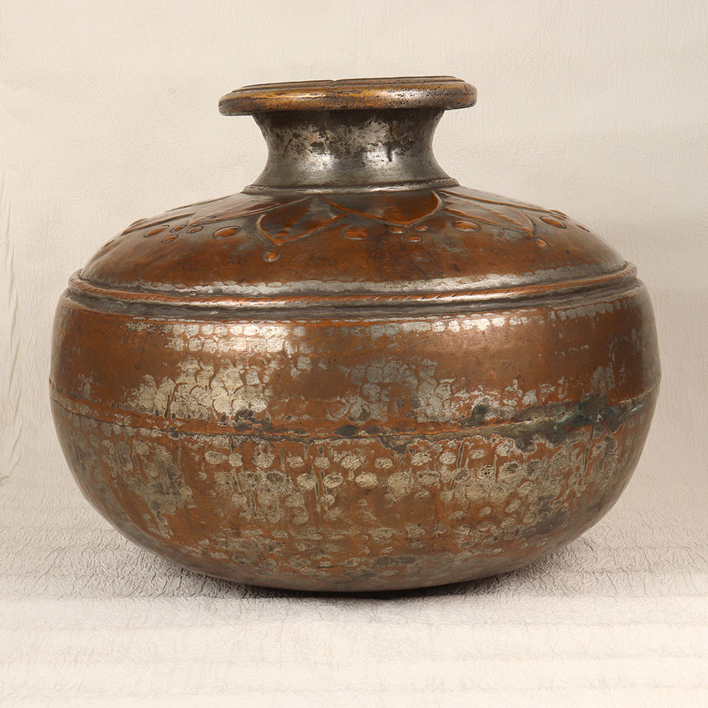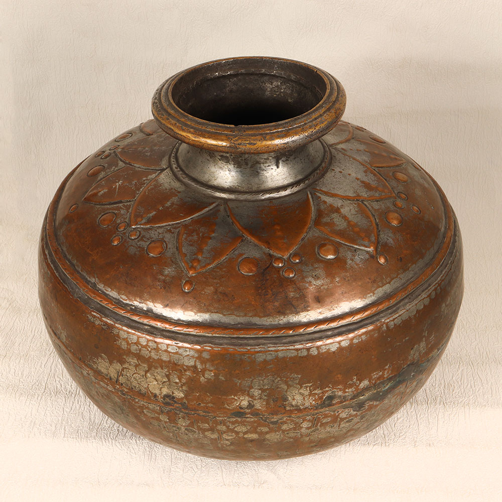 A Vintage Copper Water Pot that is a timeless piece of functional art crafted by highly skilled and experienced Indian artisans in the rich tradition of Islamic Art. Handmade with precision and care, this unique pot showcases the mastery of these artisans who have seamlessly blended tradition and craftsmanship to create a stunning piece. The pot features a small mouth adorned with intricate engravings that tell a story of cultural heritage and artistic finesse. Its antique brown finish adds a touch of nostalgia, reminiscent of a bygone era. Meticulously crafted from high-quality copper, this pot is not only a testament to the enduring beauty of Islamic Art but also a functional item that can be used as an indoor flower pot. Versatile and elegant, this Vintage Copper Water Pot can effortlessly grace any space, be it your home, office, restaurant, hotel, or cafe. Its presence adds a touch of vintage charm and sophistication, making it a perfect addition to any antique collection. Furthermore, this exquisite piece makes for an unforgettable gift on special, festive, or auspicious occasions, allowing you to share the beauty of traditional craftsmanship with your loved ones.