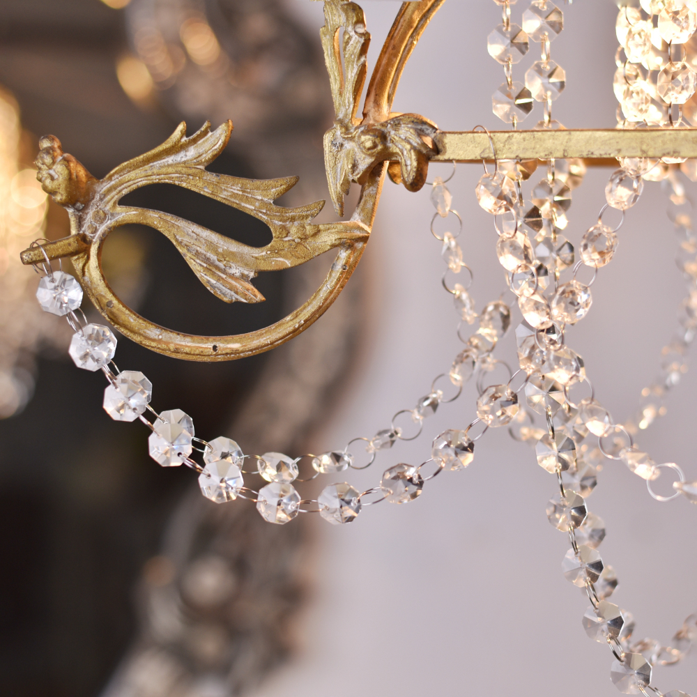 This beautiful Italian-style enameled Chandelier is the perfect addition to any room. The gilded ceiling light is accented with garland strands and a chandelier base. Vintage brass fixtures look great in a classic setting or modern style home. The Italian-style enameled Chandelier features a beautifully gilded vintage brass ceiling fitting, with elegant crystal drops that are sure to add a touch of elegance and luxury to any room. This stunning chandelier is sure to impress any guest or have the perfect mood lighting for your space. This crystal chandelier is hand-crafted with artisanal techniques. The colors are gilded and the crystals are set in a fern pattern to create an elegant look. Beautiful multi-faceted crystals, clear and sparkling make this chandelier a statement maker. This magnificent light fixture provides an elegant and timeless look for your space.