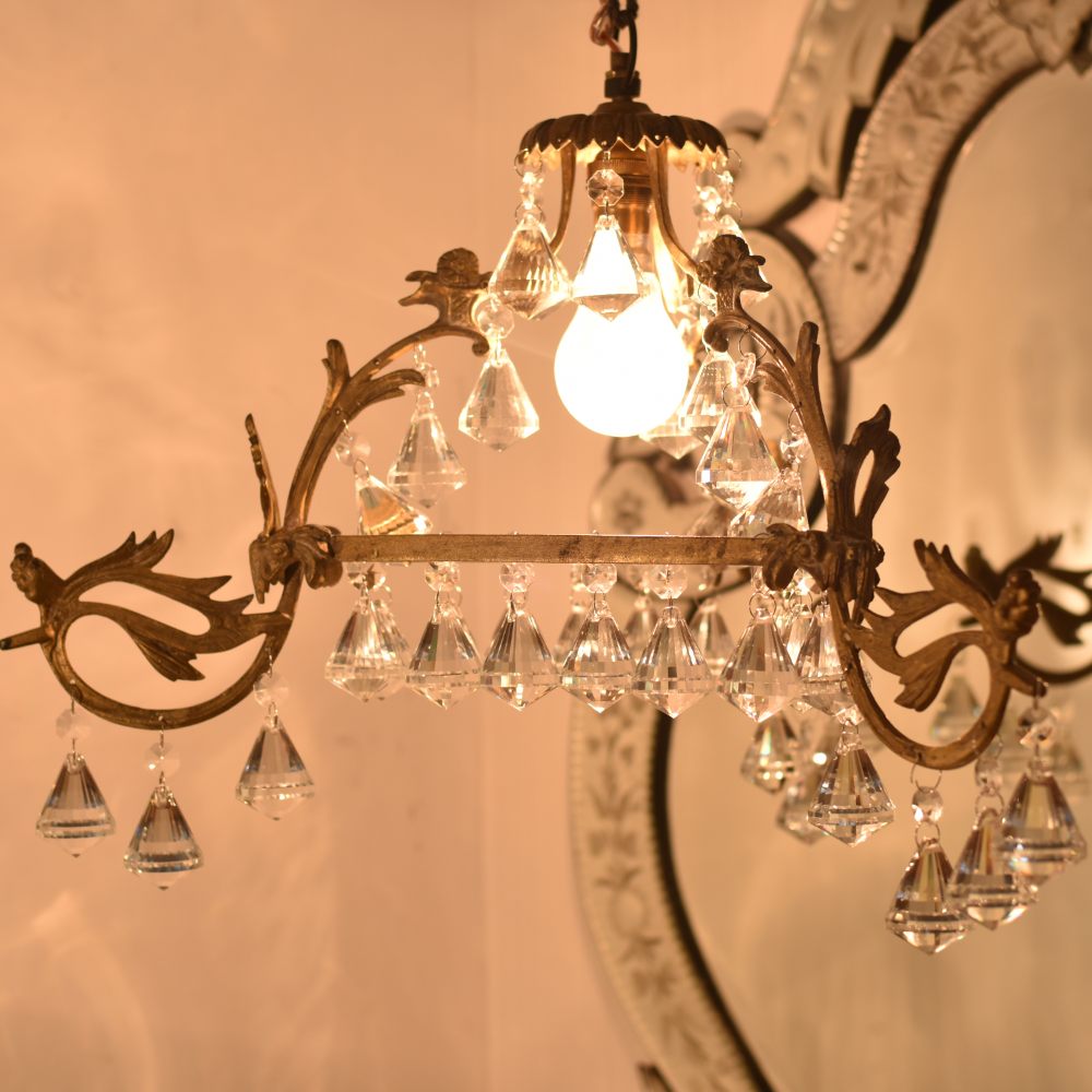 This beautiful Italian-style enameled Chandelier is the perfect addition to any room. The gilded ceiling light is accented with crystal drops and a chandelier base. Vintage brass fixtures look great in a classic setting or modern style home. The Italian-style enameled Chandelier features a beautifully gilded vintage brass ceiling fitting, with elegant crystal drops that are sure to add a touch of elegance and luxury to any room. This stunning chandelier is sure to impress any guest or have the perfect mood lighting for your space. This crystal chandelier is hand-crafted with artisanal techniques. The colors are gilded and the crystals are set in a fern pattern to create an elegant look. Beautiful multi-faceted crystals, clear and sparkling make this chandelier a statement maker. This magnificent light fixture provides an elegant and timeless look for your space.