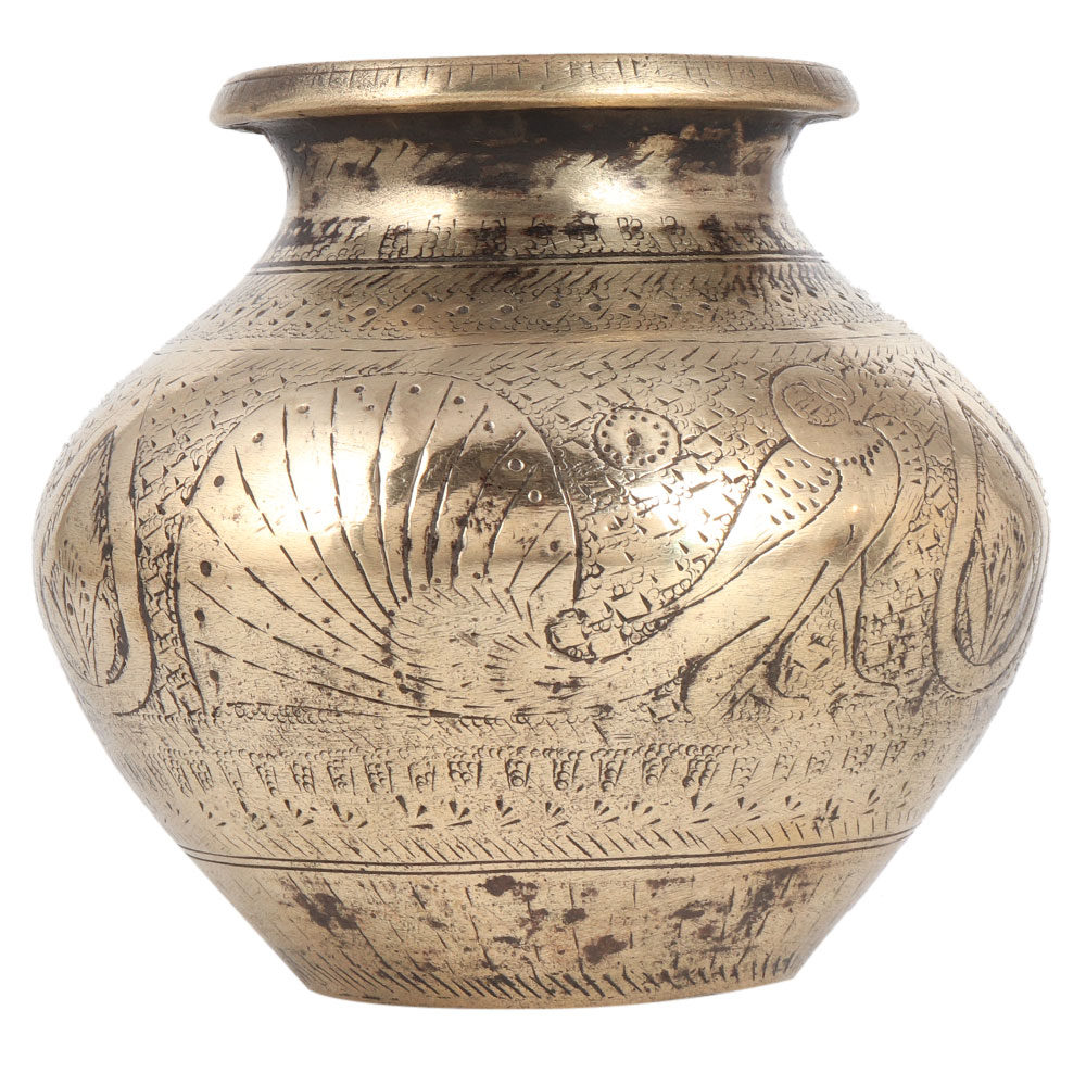 A perfect example of artistic work. This vintage Kalash water pot was engraved with intricate details by Indian craftsmen. A peacock is engraved on the sides of the Kalash and an attractive pattern is engraved on the entire Kalash. It has a flat surface. You can use this pot for stage decoration. Use it as a flower pot for your home. This Kalash is often used for decoration on various occasions. An ideal gift for Deepavali, Christmas or spiritual events.