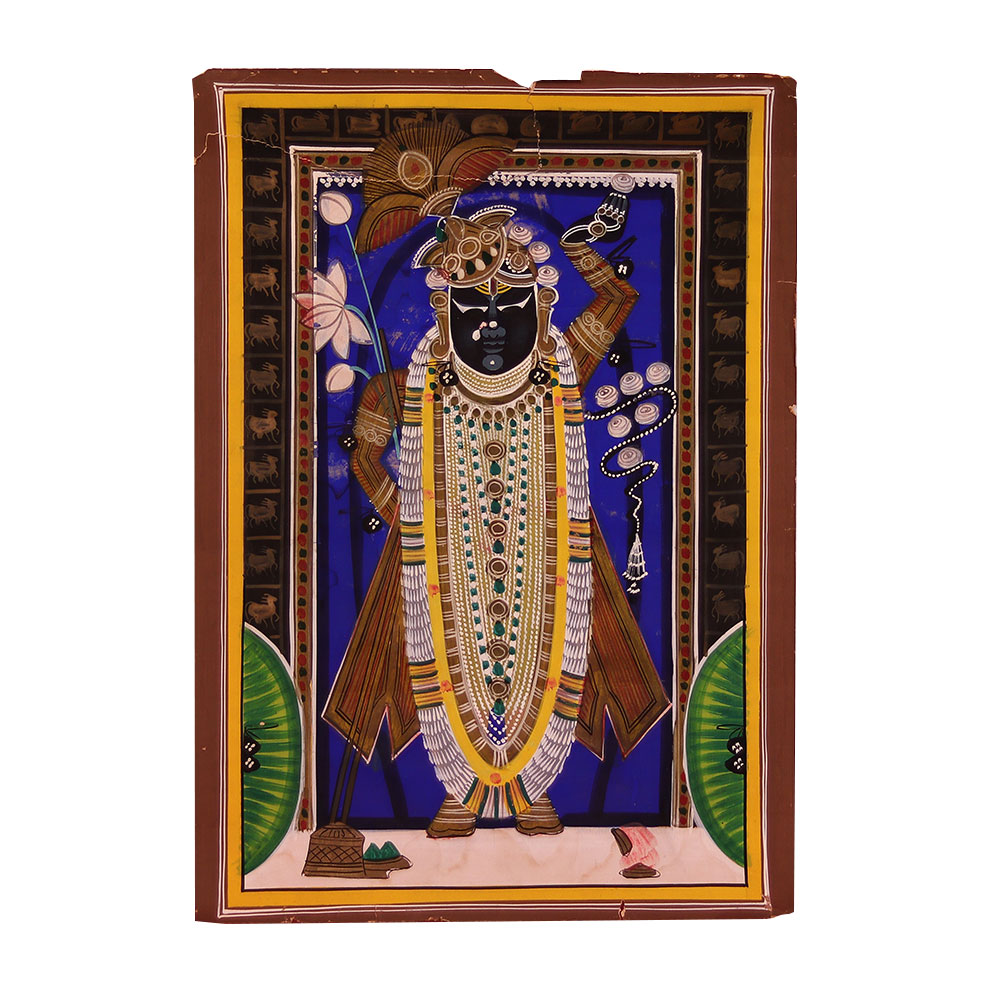 Prepare to be captivated by the timeless elegance and divine essence of this stunning vintage painting depicting Lord Krishna in the Din ke Darshan condition at the revered Nathdwara Temple. This exquisite work of art transports you to a realm of spiritual wonder and artistic mastery. Immerse yourself in the captivating beauty and profound significance of this painting, which serves as a window into the rich cultural and religious heritage of India. Display this masterpiece in your home or sacred space and allow its timeless allure to elevate your spiritual journey and inspire deep reverence for the divine. Whether you are a seasoned art collector, a devotee of Lord Krishna, or simply someone seeking to surround yourself with the enchanting essence of India's spiritual traditions, this vintage painting is a true gem that will captivate and enrich your life. Experience the divine connection and timeless elegance that this exquisite work of art has to offer.