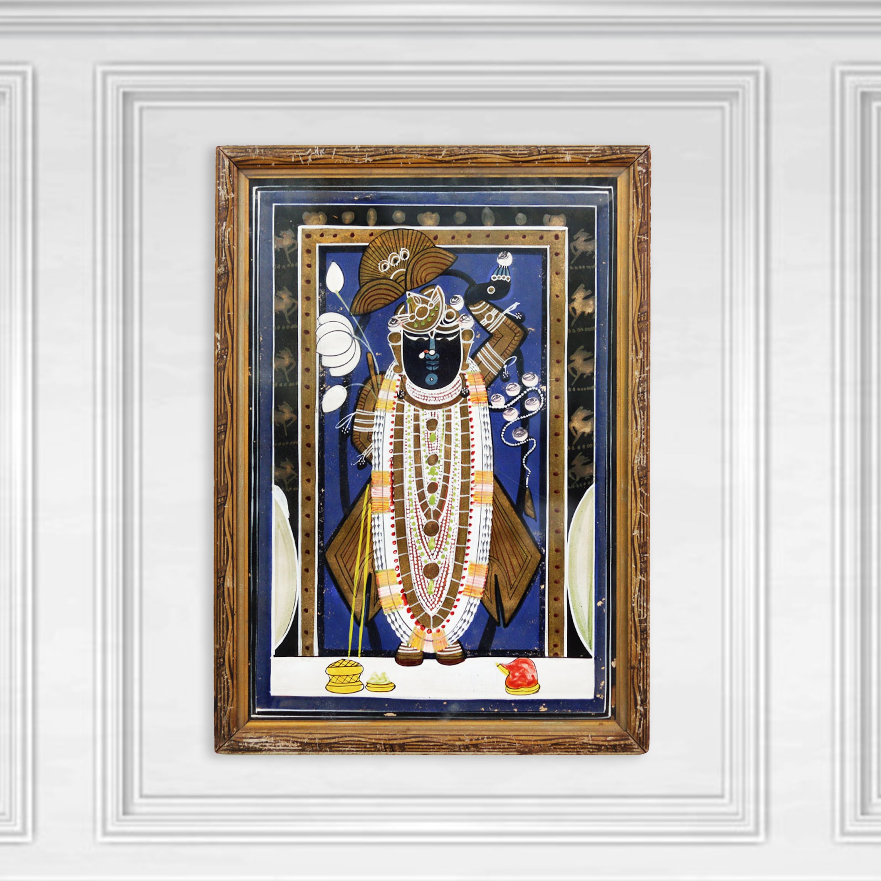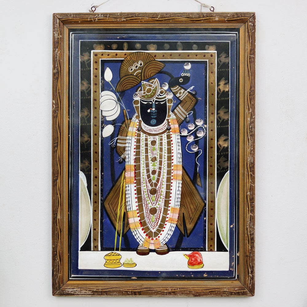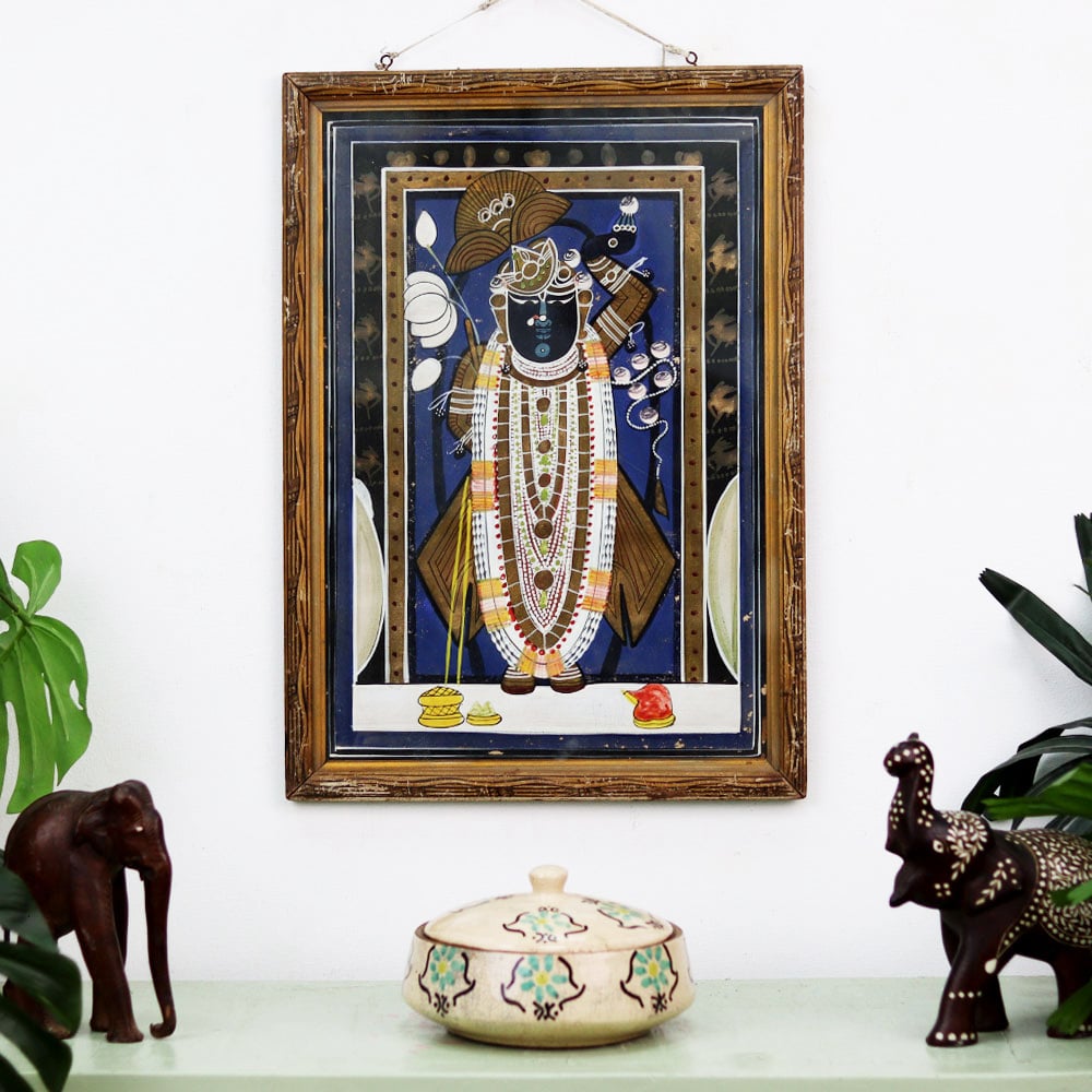 Discover the divine essence of Lord Krishna in this captivating vintage painting from the heart of Rajasthan. Titled "Raat ke Darshan," this masterpiece invites you to bask in the ethereal glow of the night sky as it frames the enchanting figure of the beloved deity. This painting is more than just a work of art - it's a window into the rich cultural heritage of India. The skilled artisans of Rajasthan have poured their hearts and souls into this piece, capturing the essence of Lord Krishna's divine presence. As you gaze upon this masterpiece, you'll be transported to a realm of serenity and wonder, where the boundaries between the physical and the spiritual blur. Whether you're a collector of fine art, a devotee of Lord Krishna, or simply someone who appreciates the beauty of the world, this painting is a must-have. It will not only enhance the ambiance of your living space but also serve as a constant reminder of the profound spiritual connection that lies within us all. Bring home this captivating piece of Rajasthani history and let it inspire you to embark on a journey of self-discovery and enlightenment.