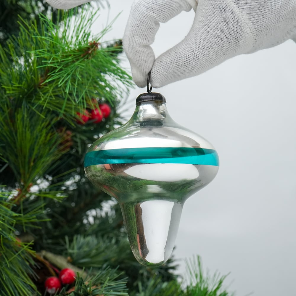 Vintage MercurySilver and Turquoise Glass Hanging Ornament. Crafted from high-quality glass with a smooth glossy finish, this decorative bauble adds a classic and festive touch to Christmas trees, wreaths, and holiday displays.