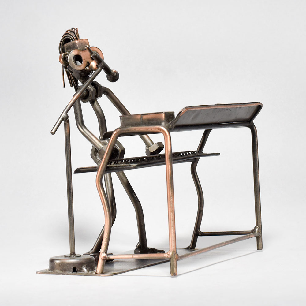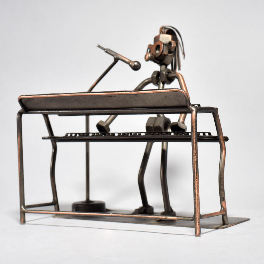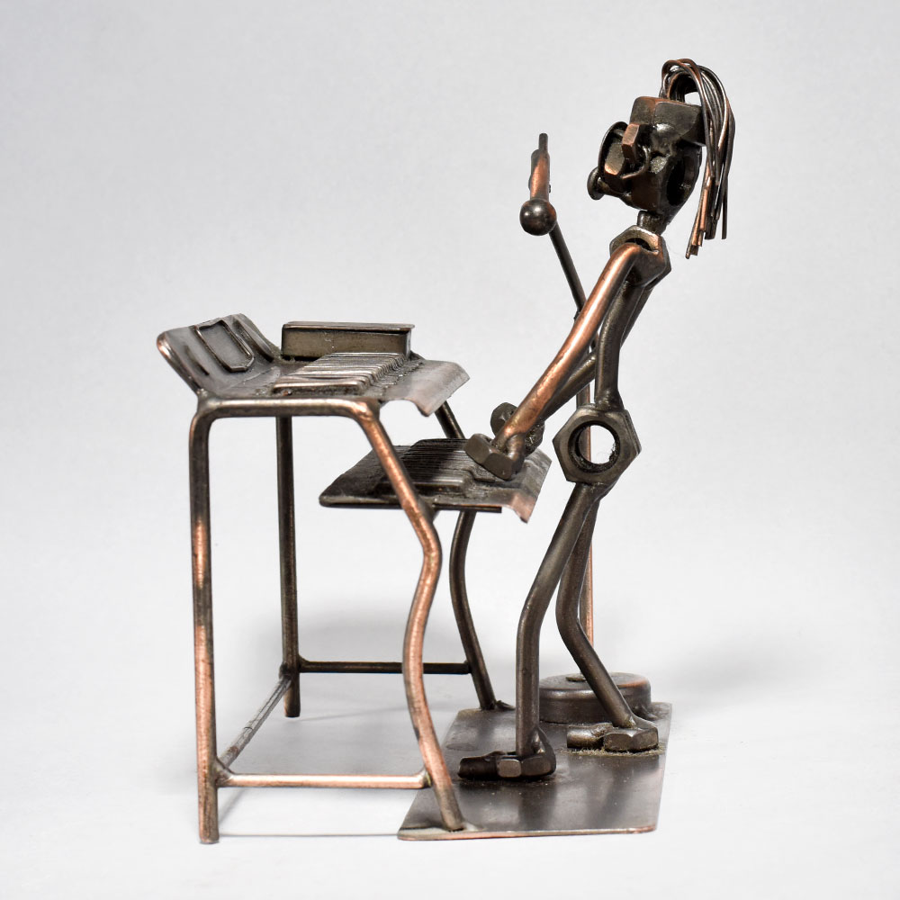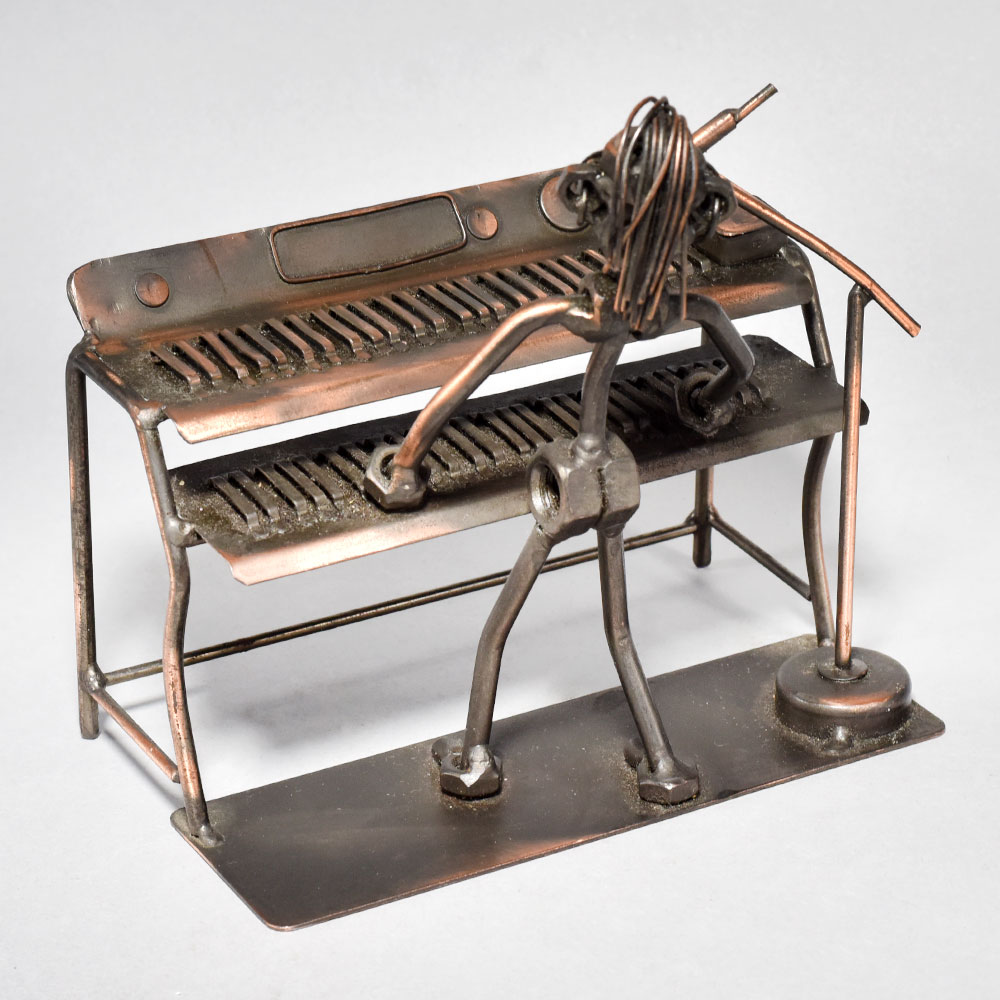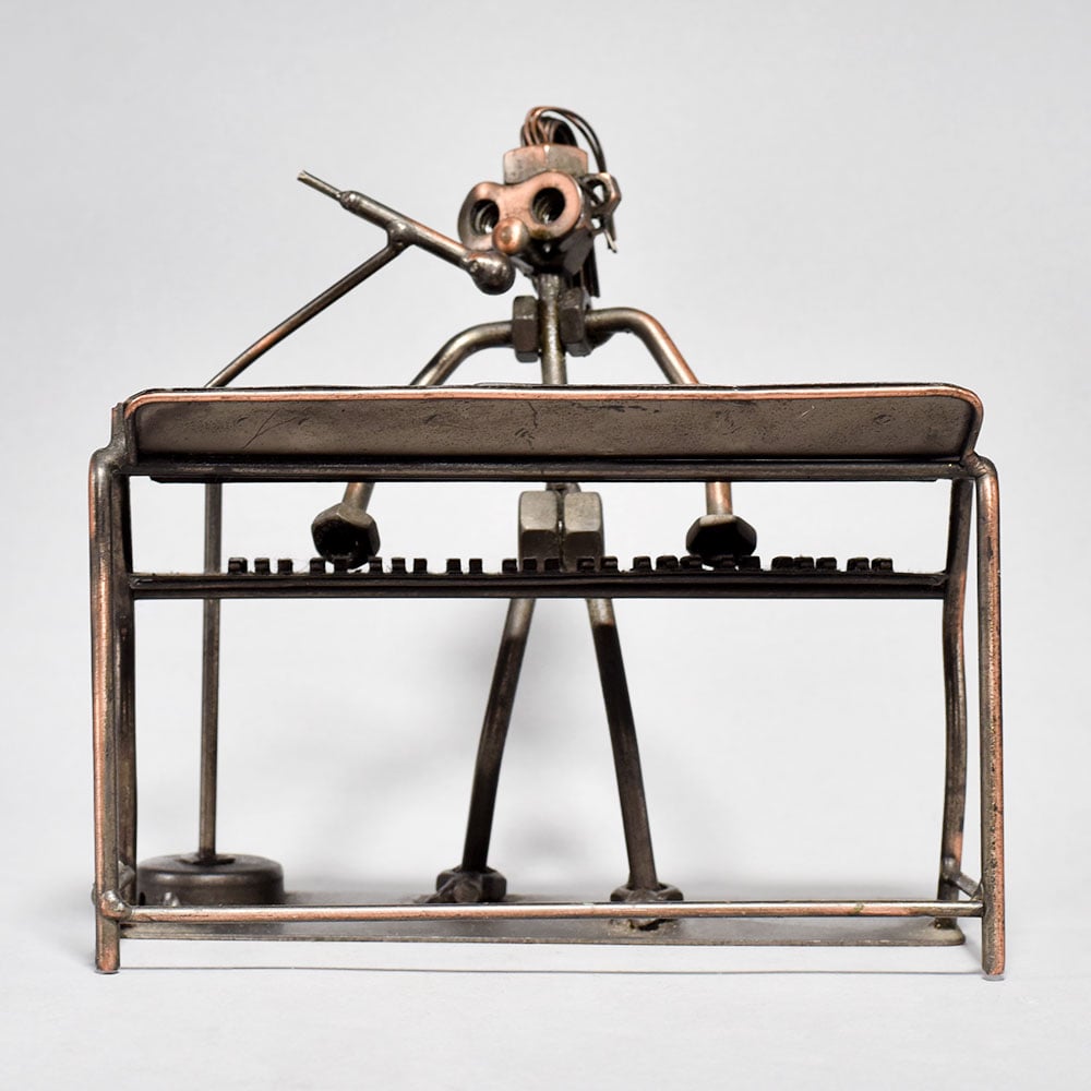 Unlock the captivating harmony of timeless artistry with this stunning vintage metal sculpture.This vintage modern art piece transports you to a bygone era, where the soul-stirring strains of the piano fill the air. Lose yourself in the raw emotion and artistry of the musician's performance, immortalized in striking metal. Display this one-of-a-kind sculpture in your home or office to infuse any space with an air of vintage elegance and timeless creative spirit. Crafted with intricate, museum-quality detail Captures the essence of a musician engrossed in passionate performance Depicts a figure playing a piano, showcasing their love for music Made of durable iron for long-lasting display This unique handcrafted piece is a testament to traditional artistry, blending functionality with beauty and making it a treasured collectible for years to come. This unique handcrafted piece is a testament to traditional artistry, blending functionality with beauty and making it a treasured collectible for years to come.