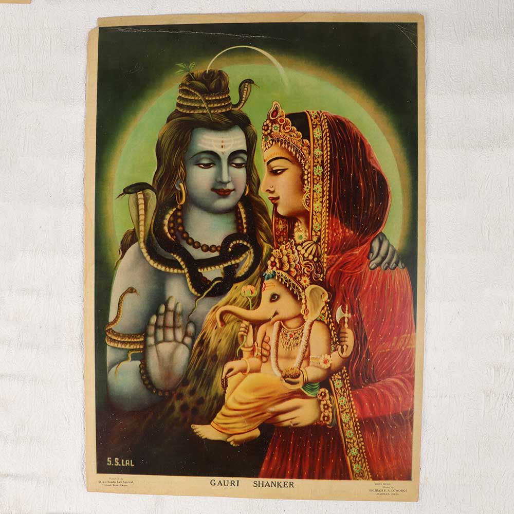 Evoking the richness of Bengal's artistic heritage, this exquisite vintage oleograph paper print transports you to a sacred world of Hindu deities. Featuring Lord Shiva and Goddess Parvati with baby Ganesha, this rare artwork crafted by renowned Bengali artist S.S. Lal will add an heirloom aura to your home decor. This museum-worthy masterpiece allows you to honor the presence of the divine Hindu triad - Shiva, Parvati, and Ganesha - in your living space. Place it on your puja altar to focus your meditations and prayers. Or showcase it proudly as a cultural conversation piece. For collectors and devotees alike, this vintage art is a must-have.