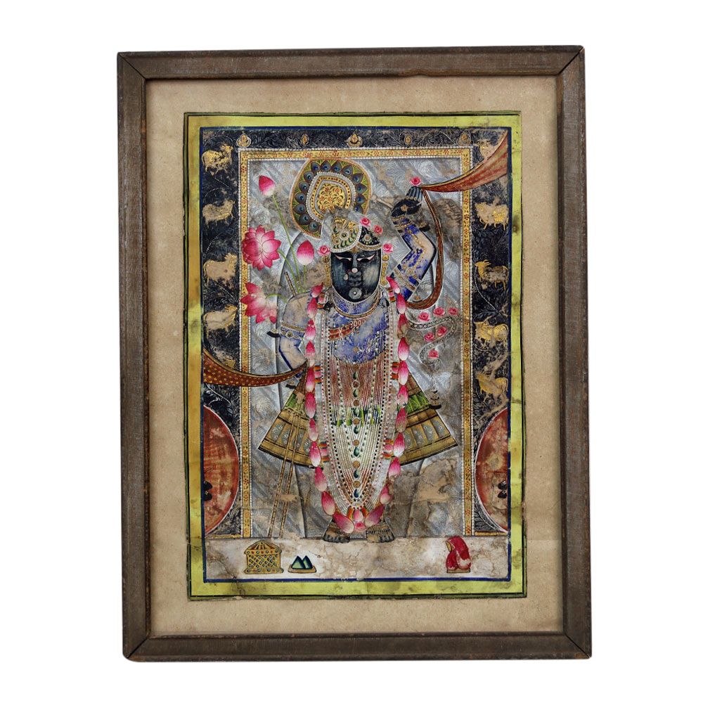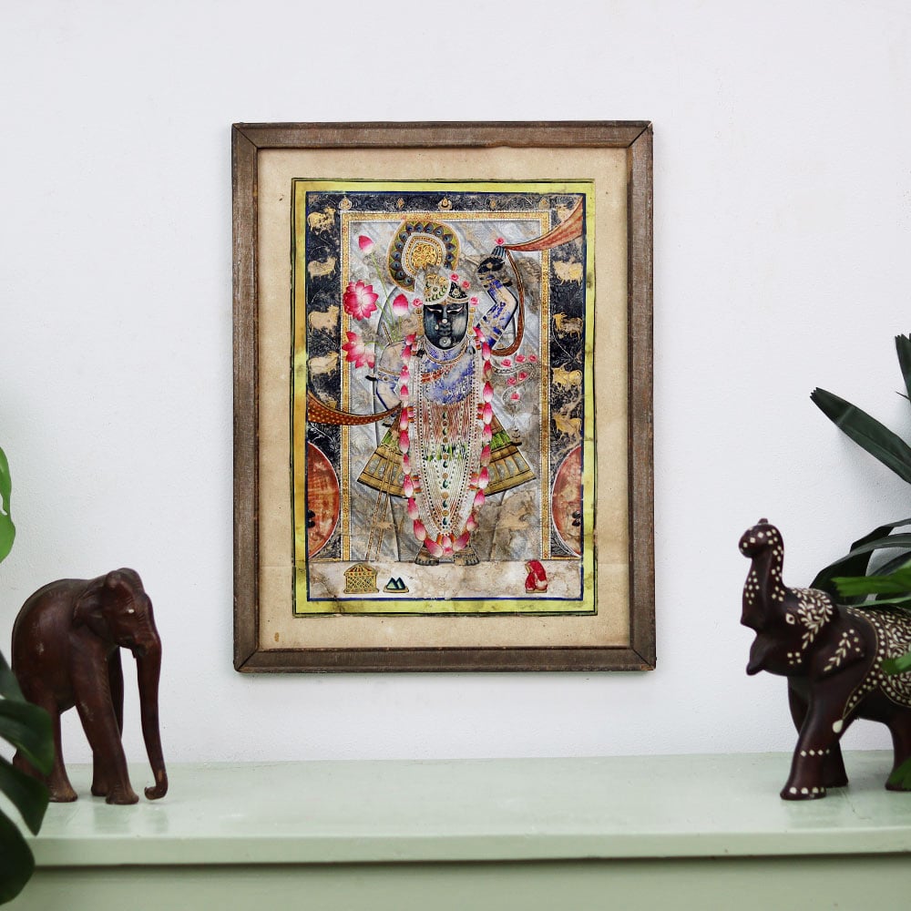Immerse yourself in the enchanting world of Hindu spirituality with this exquisite vintage paper painting featuring the beloved Lord Krishna. Masterfully crafted with intricate gold work, this piece showcases the divine grace and majesty of the revered deity, captured in a serene moment with his loyal cow companion. Hailing from the renowned Nathdwara School of art in Rajasthan, this painting embodies the rich cultural heritage and meticulous artistry of the region. The vintage paper provides a captivating backdrop, allowing the golden accents to shimmer and the vibrant colors to truly come alive. Whether you're a collector of fine art or simply seeking to elevate your living space with a touch of spiritual elegance, this painting is a must-have addition to your home. Invite the blessings and positive energy of Lord Krishna into your life by displaying this exquisite work of art. Its timeless appeal and stunning visual impact will instantly transform any room, serving as a constant reminder of the divine beauty and wisdom that permeates the Hindu faith. Elevate your decor and enrich your spiritual journey with this captivating piece from the Nathdwara School.