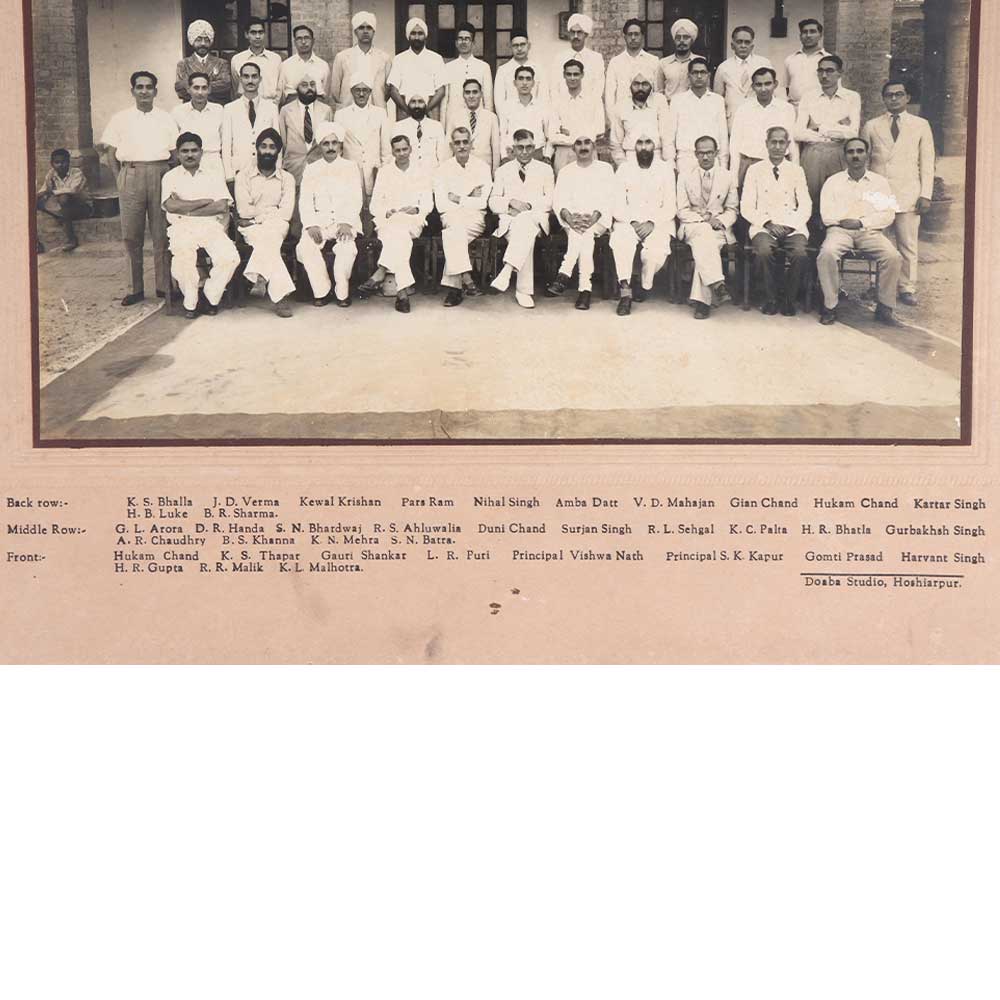 Step back in time with this stunning vintage black and white photograph of the teaching staff at Government College in Hoshiarpur, Punjab. This glimpse into the past evokes nostalgia and transports you to a simpler era. This rare photograph provides a window into the world of academia in the 1940s. See the distinguished scholars and educators who shaped young minds at this prestigious Indian college. For history buffs, those with ties to Hoshiarpur, or anyone who wants a piece of the past to display, this vintage staff photo is a must-have. Evoking nostalgia for a simpler time, it will upgrade any wall or bookshelf.