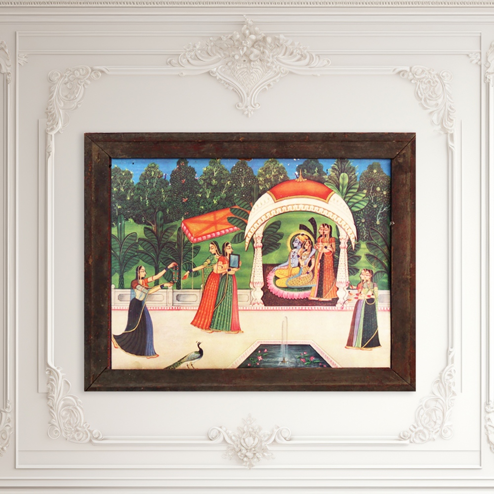 Elevate your home with the timeless beauty of the "Vintage paper print of Radha Krishna of Shingar." This captivating artwork transports you to the enchanting world of Hindu mythology, featuring the divine lovers Radha and Krishna in a state of blissful union. Immerse yourself in the timeless romance of Radha and Krishna. This vintage paper print captures the essence of the Shingar, or divine love, that permeates Hindu scriptures and art. The masterful brushstrokes and vibrant hues invite you to lose yourself in the sacred moment, evoking a sense of serenity and wonder. Whether you're a collector of fine art or simply seeking to elevate your living space, this Radha Krishna print is a must-have. It seamlessly blends traditional Indian aesthetics with a modern sensibility, making it a stunning focal point for your home. Display it in your living room, meditation space, or bedroom to infuse your environment with the energy of timeless love and spirituality.