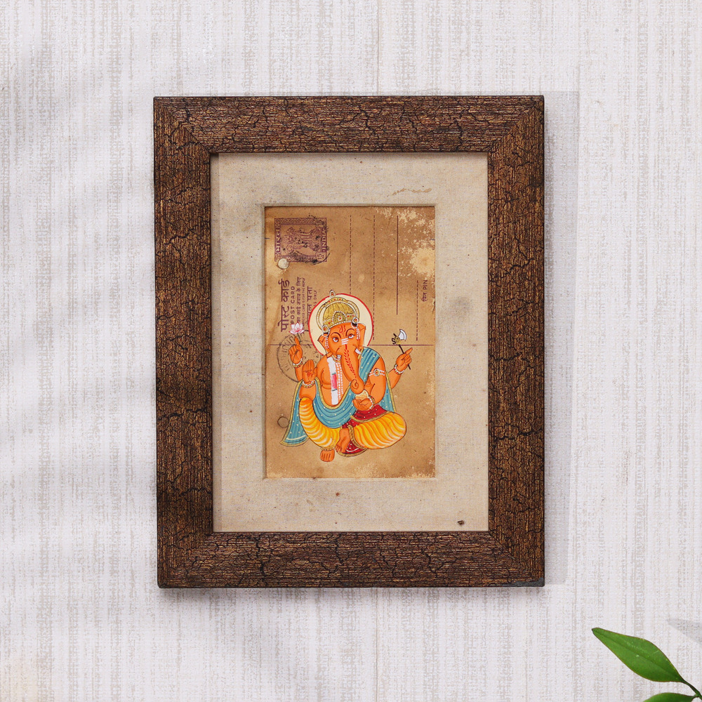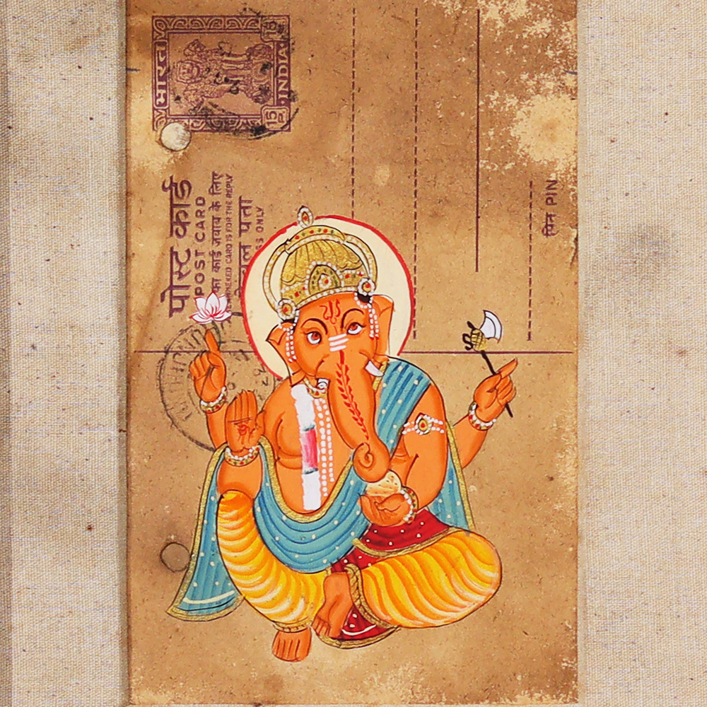 Discover the timeless allure of this one-of-a-kind vintage postcard hand painting featuring the revered Lord Ganesha. Infused with intricate details and a captivating aesthetic, this piece will transport you to a realm of divine inspiration. This stunning Ganesha painting is more than just a work of art - it's a gateway to deeper spiritual connection. Gaze upon the elephant-headed deity's serene countenance and feel your worries melt away, replaced by a sense of inner peace and clarity. Display this treasure in your meditation space or living room to cultivate an atmosphere of harmony and positive energy. Whether you're a seasoned collector of spiritual art or simply seeking to infuse your home with uplifting vibes, this vintage Ganesha painting is a must-have. Invite the blessings and protection of this revered figure into your life and let his timeless wisdom guide you on your personal journey. Elevate your space and nourish your soul with this exquisite work of art.