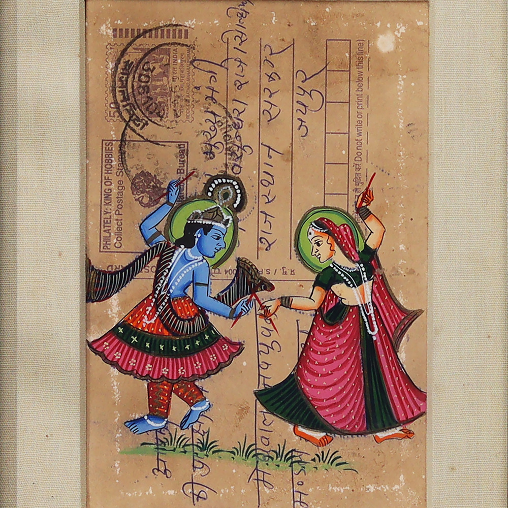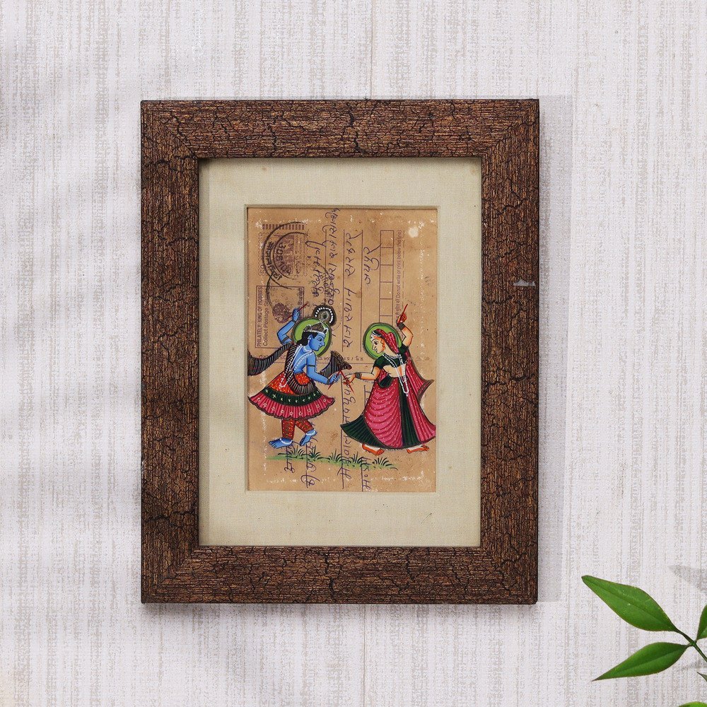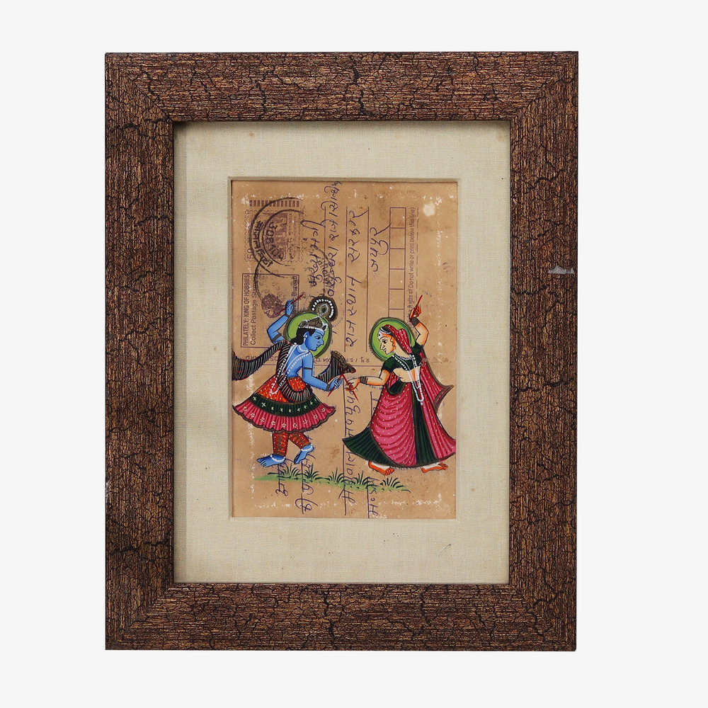Breathe new life into an ancient love story with this stunning vintage postcard hand painting of Radha Krishna. Expertly crafted and beautifully framed, this one-of-a-kind artwork brings the timeless romance of these divine lovers to life in vivid color and detail. This exquisite painting transports you to the lush, mystical world of Krishna and his beloved Radha. Radiant hues of blue, green, and gold dance across the canvas, capturing the divine couple's eternal embrace. Every brushstroke radiates the passion and devotion that defined their legendary love story. Whether you're a collector of fine art or simply seeking to infuse your home with timeless beauty, this Radha Krishna painting is a must-have. Display it prominently to inspire wonder, contemplation, and a deeper connection to the spiritual realm. As a thoughtful gift, it will be cherished for years to come, a tangible reminder of life's most profound love.