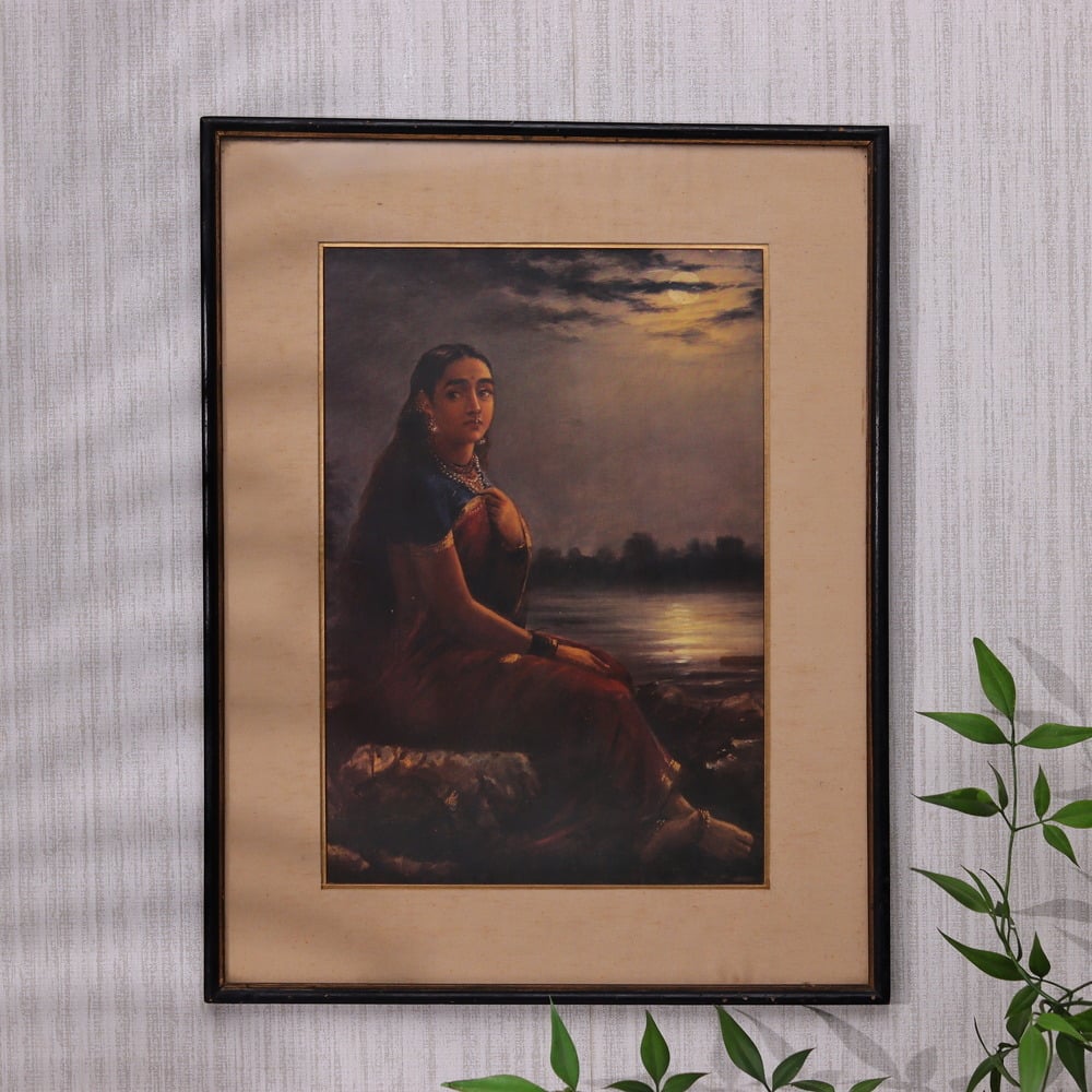 Discover the allure of a bygone era with this stunning vintage Ravi Verma painting print, encased in a rustic wooden frame. This exquisite work of art transports you to a world of beauty, elegance, and timeless charm. This Ravi Verma masterpiece is a true feast for the senses. The intricate details and rich, vibrant hues of the painting draw you in, inviting you to lose yourself in the captivating gaze of the subject. The wooden frame adds a touch of rustic sophistication, making this piece a stunning addition to any space. Whether you're an art enthusiast, a lover of Indian culture, or simply someone who appreciates the beauty of the human form, this vintage Ravi Verma painting print is sure to captivate and inspire. Hang it in your living room, bedroom, or study to elevate the ambiance and ignite the imagination. Experience the timeless elegance of this masterpiece and let it transport you to a world of artistic wonder.