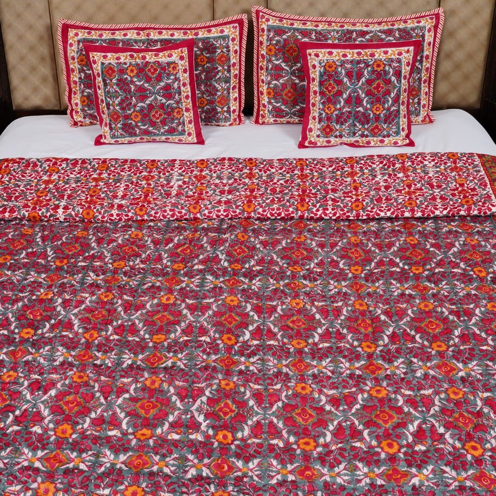 This red multicolor Malmal (Voile) quilt brings a touch of royal warmth to your bedroom with its intricate floral hand-block patterns and rich traditional hues. Made from fine cotton voile, it combines lightweight comfort with exquisite craftsmanship. Expertly handmade and quality-checked by Indianshelf, this quilt beautifully reflects India’s textile artistry.