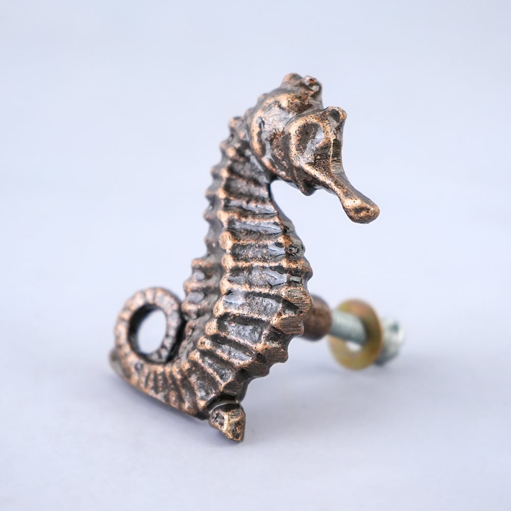 Add a unique touch to your furniture with this vintage seahorse iron cabinet knob. Perfect for drawers, cabinets, and cupboards, this durable decorative knob features an antique finish and marine-inspired design ideal for coastal or rustic interiors.