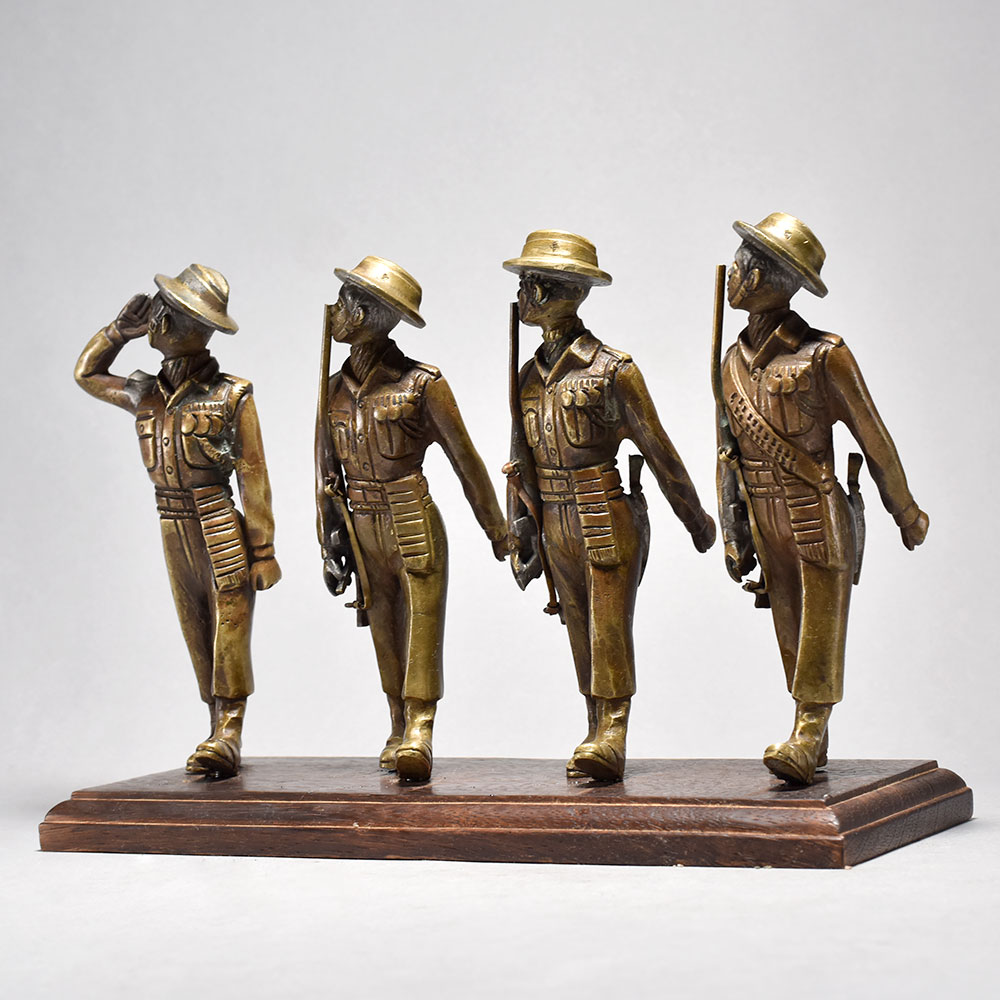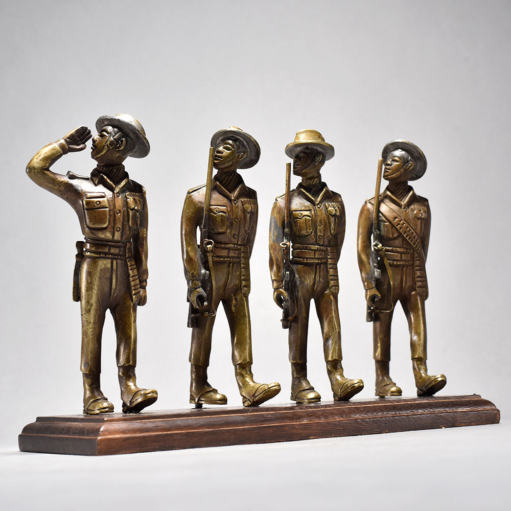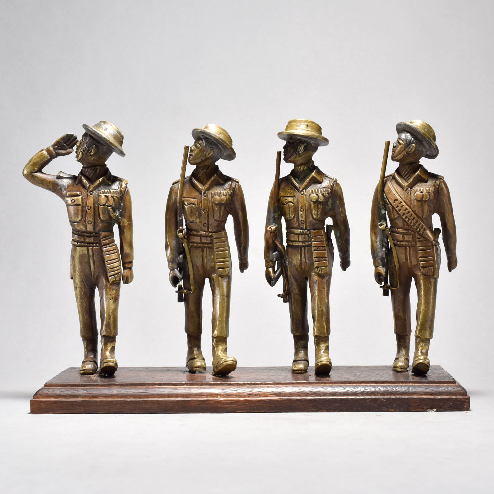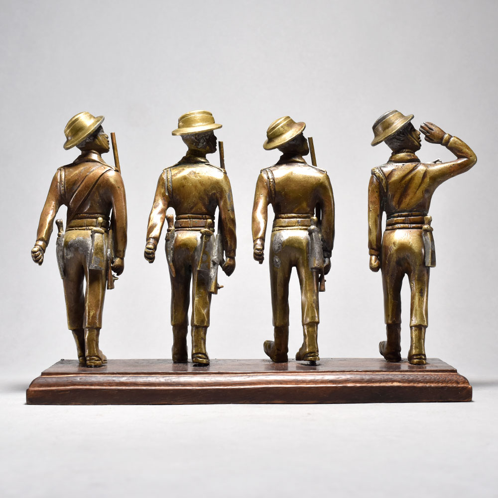 Salute to history Bring home this charming vintage brass 4 soldiers figurine that captures the timeless elegance of English period art.This vintage brass 4 soldiers figurine is a stunning piece that will transport you back in time. Showcasing the meticulous attention to detail that defined English period art, this collectible piece is a must-have for history buffs and home decor enthusiasts alike. Display it proudly as a conversation starter that adds a touch of old-world sophistication to any space. Whether you're looking to enhance your personal collection or seeking the perfect gift for the Anglophile in your life, this vintage brass soldiers is sure to delight. Its classic design and superior craftsmanship make it a timeless treasure that will be cherished for years to come. Expertly crafted from solid brass This timeless piece is handcrafted by skilled artisans using time-honored techniques, ensuring each creation is truly one of a kind. Its versatile design makes it suitable for living rooms, bedrooms, offices, or meditation spaces, bringing a sense of heritage and style wherever it is displayed.