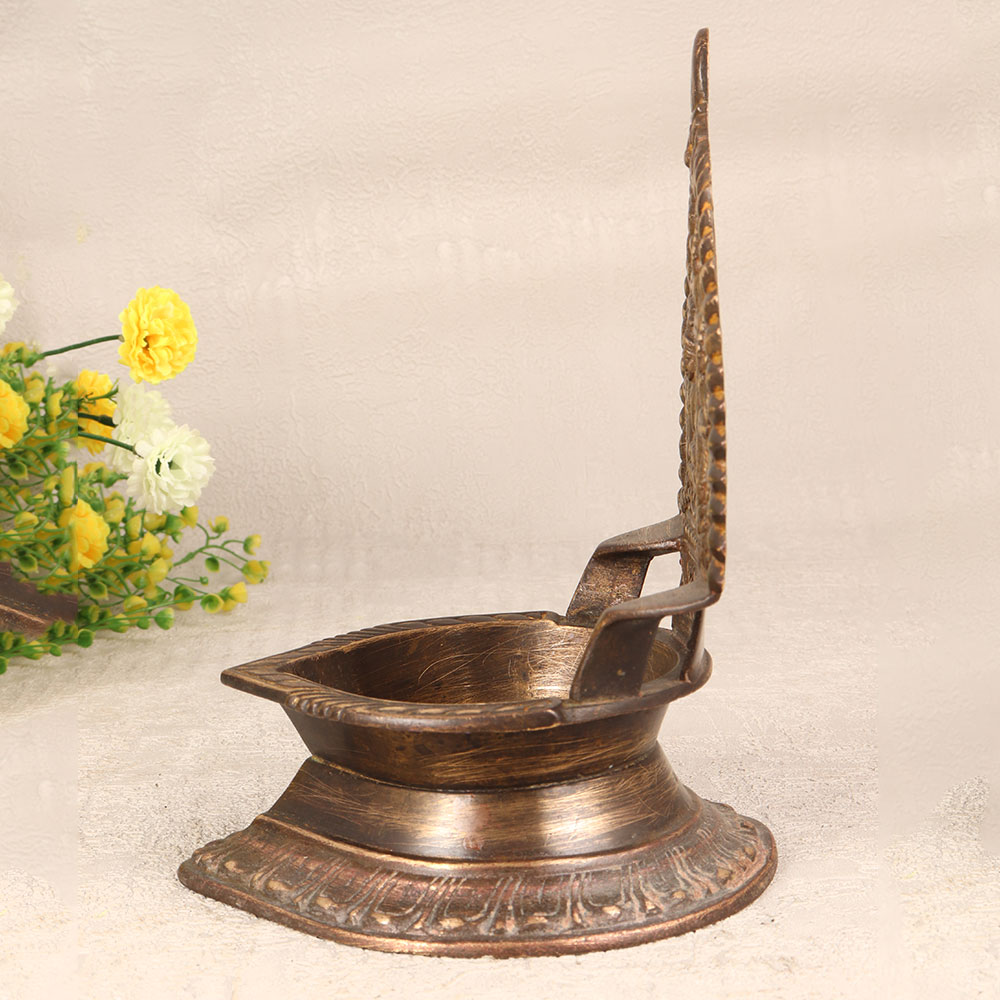 Celebrate the essence of tradition and spirituality with our exquisite Vintage Brass Gajlaxmi Oil Lamp. Crafted by skilled Indian artisans in the timeless South Indian art form, this diya pays homage to Goddess Gajlaxmi, beautifully carved onto its surface. The antique brown finish adds an air of antiquity, making it a captivating addition to any space. Made from high-quality brass, this lamp is a testament to both craftsmanship and cultural richness. Illuminate your surroundings with the warm glow of mustard oil or ghee, using a traditional cotton wick. Its versatility allows it to grace the sacred corners of your home, office, restaurant, hotel, or cafe prayer room, creating an ambiance of tranquillity. Perfect for both decor enthusiasts and spiritual seekers, this lamp seamlessly blends functionality with aesthetic appeal. Elevate your vintage collection or present it as a thoughtful gift to loved ones on special, festive, or auspicious occasions.