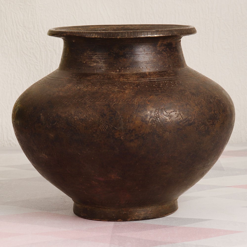Decorate your home interior with the timeless charm of this Vintage Brass Holy Water Pot. Meticulously crafted by talented Indian artisans, this piece embodies the rich heritage of South Indian art. Its antique brown finish exudes an old-world allure, making it a unique and versatile addition to any setting. This handcrafted masterpiece is constructed from high-quality brass, ensuring its longevity and resilience. Whether it graces your home, office, restaurant, hotel, café, or shop, it brings an aura of elegance and grace. It can be used as an indoor flower pot, blending aesthetics with function. Furthermore, the brass holy water pot finds its significance during havan, rituals, and auspicious ceremonies, serving as a vessel to hold holy water. Placing it in the north direction of your room is believed to emanate positive energy, enhancing the ambiance of your space. An ideal addition to any vintage collection, this pot also makes for a thoughtful gift for loved ones during special, festive, or auspicious occasions.
