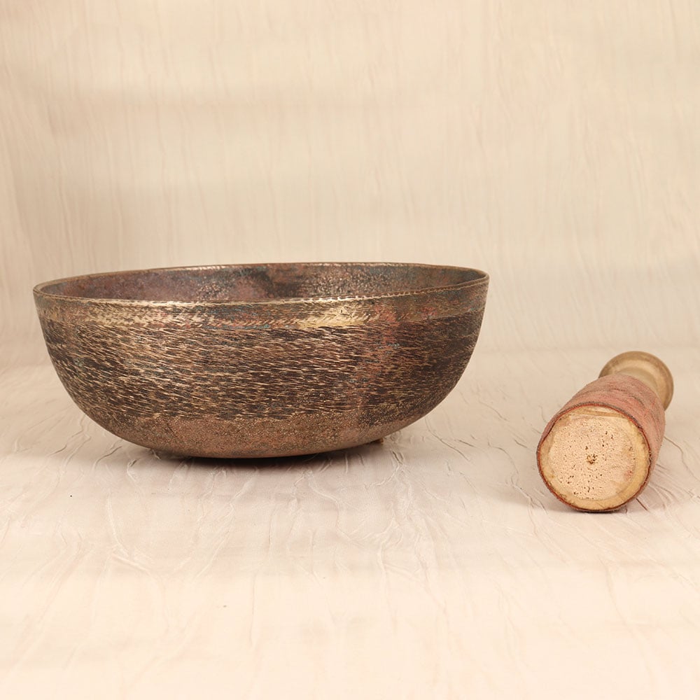 Immerse yourself in the timeless, meditative power of the om with this exquisite singing bowl. Expertly forged from a rare alloy of copper, tin, and other metals, this vintage-inspired piece emanates a hauntingly beautiful tone that will transport you to a state of profound calm and clarity. Whether you're a seasoned yogi or simply seeking a natural way to unwind, this om singing bowl is your gateway to a higher plane of consciousness. The resonant vibrations it produces trigger the body's relaxation response, lowering stress hormones and allowing your mind to drift into a blissful, meditative state. Use the included wooden mallet to effortlessly create mesmerizing tones that reverberate through your entire being, guiding you towards inner peace and spiritual enlightenment. This om singing bowl makes the perfect addition to any mindfulness practice, home meditation space, or sacred ritual. Elevate your daily routine and invite the power of the universe into your life with this stunning, one-of-a-kind singing bowl.