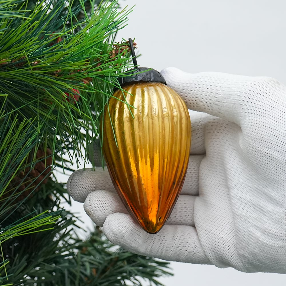 Vintage style Ribbed Amber Glass Christmas Ornament. Crafted from high-quality glass with a smooth glossy finish, this decorative bauble adds a classic and festive touch to Christmas trees, wreaths, and holiday displays.